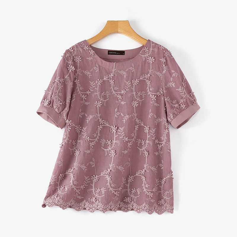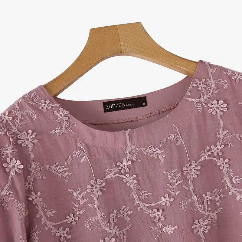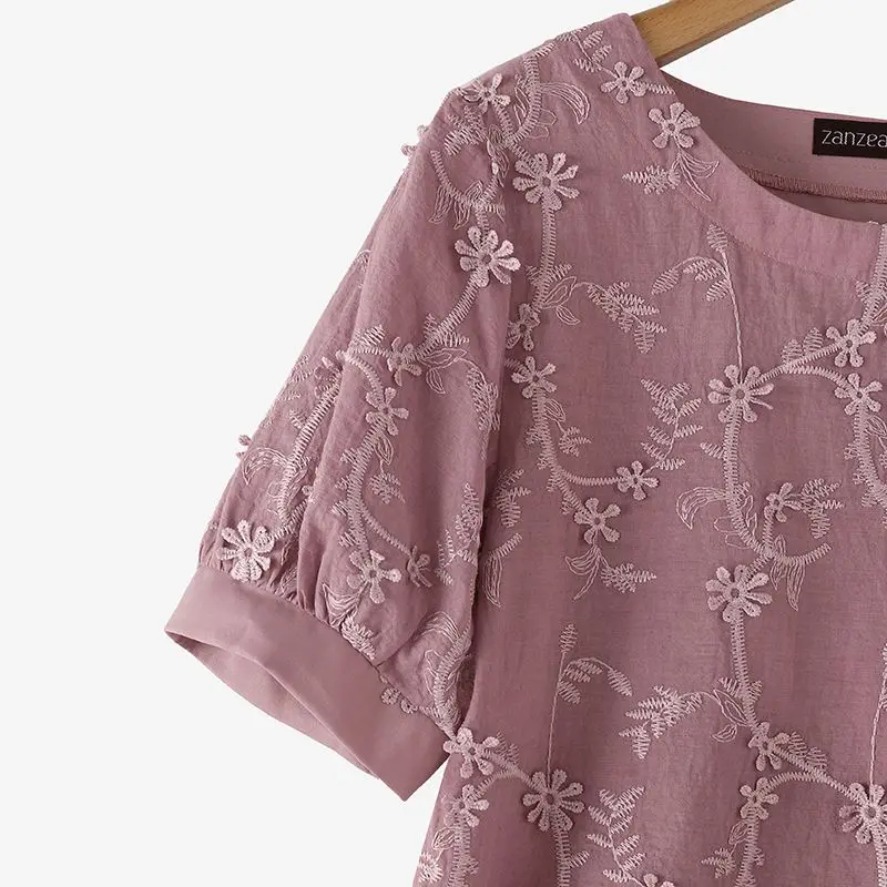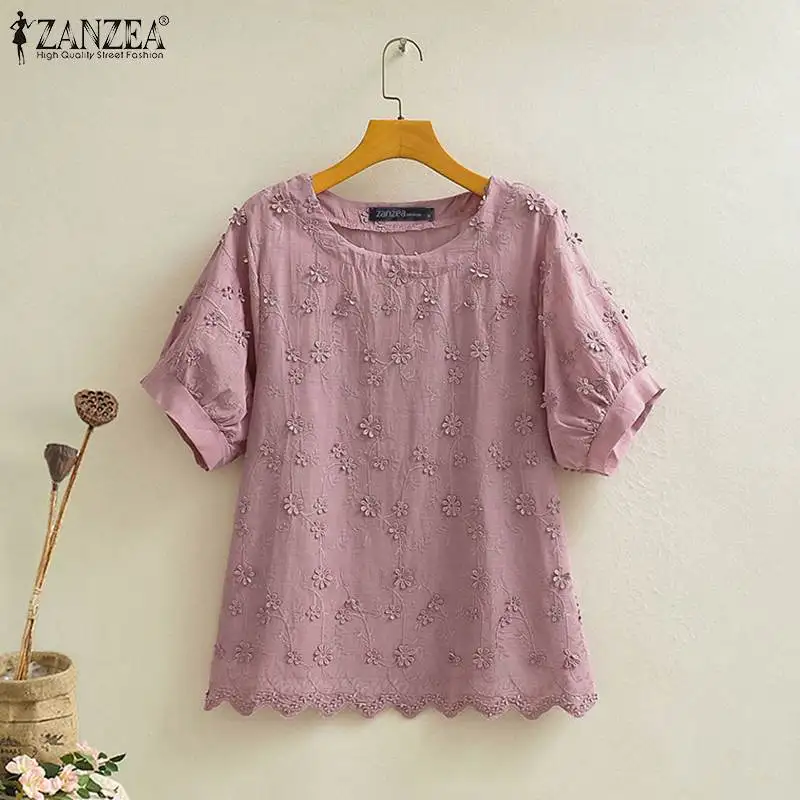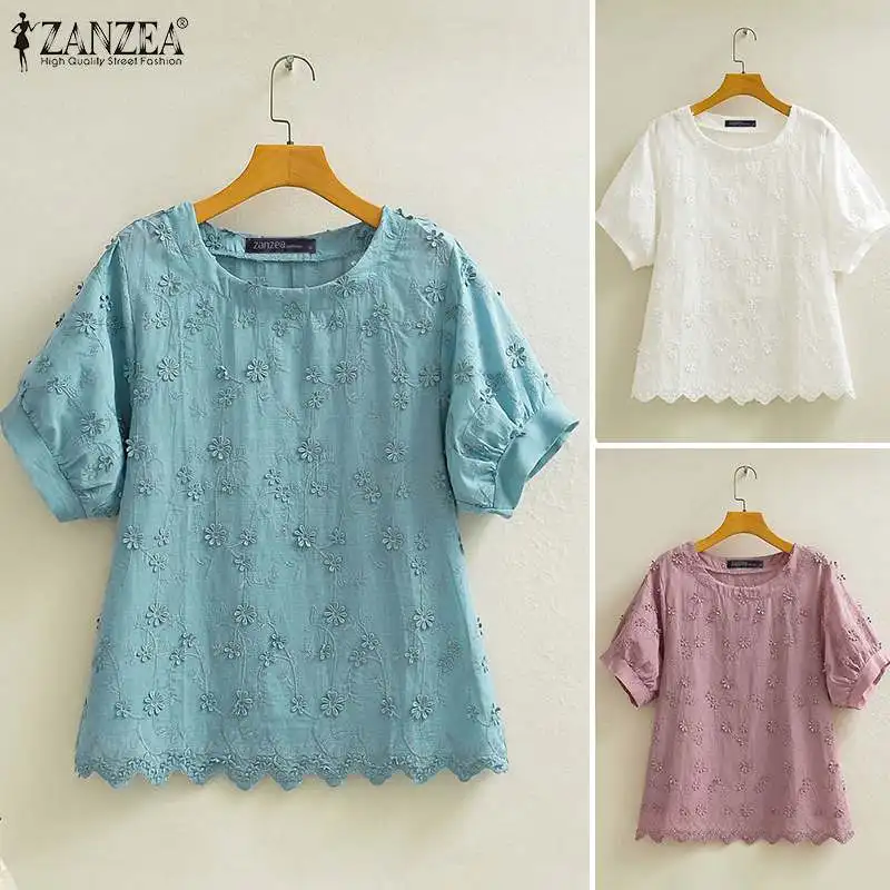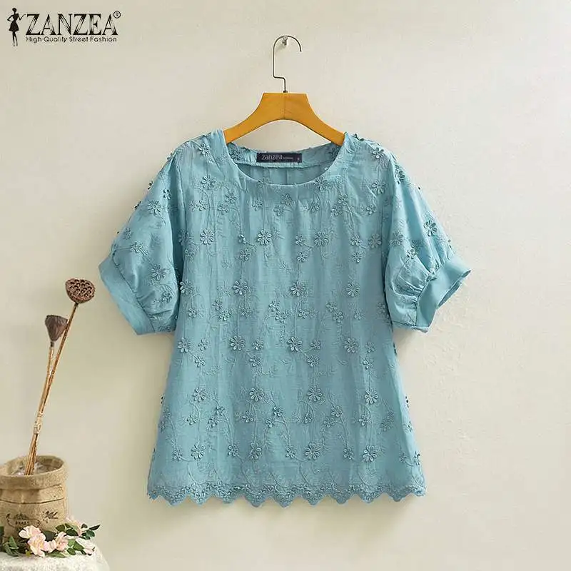 ZANZEA Women Elegant Floral Embroidery Lace Blouses Casual Short Puff Sleeve Solid Color Blusas Mujer 2024 Summer Daily Shirts