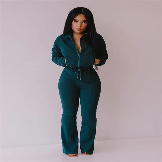 2021 High quality women clothing zip Sweatshirt casual bell bottom pants two piece set