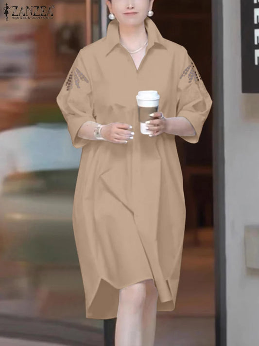 ZANZEA Casual Loose OL Work Shirt Dress Women Summer 3/4 Sleeve Lace Crochet Vestidos Holiday Sundress Buttons Down Robe Kaftan