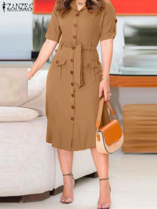 ZANZEA 2024 Summer Sundress Women Fashion Lapel Neck Short Sleeve Dress Overalls Vestidos Elegant OL Work Sundress Midi Robe