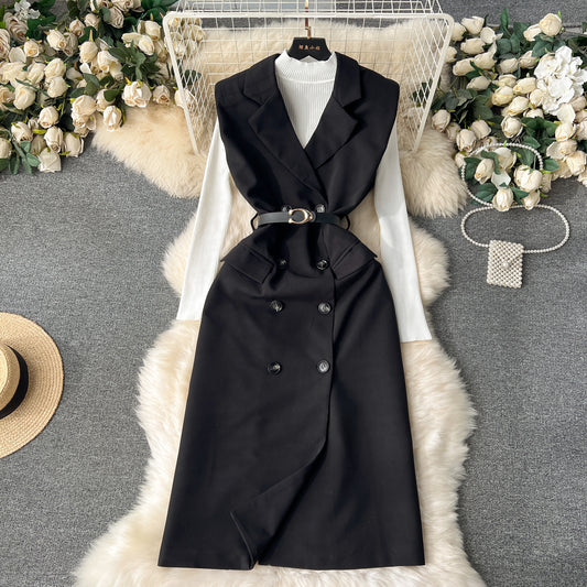 Knitted Bottoming Shirt Versatile Retro Double Breasted Business Suit And Dress Two-piece Set