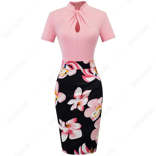 Elegant Work Office Business Drapped Contrasting Bodycon Slim Lady Women Sexy Front Key Hole Summer Pencil Dress EB430