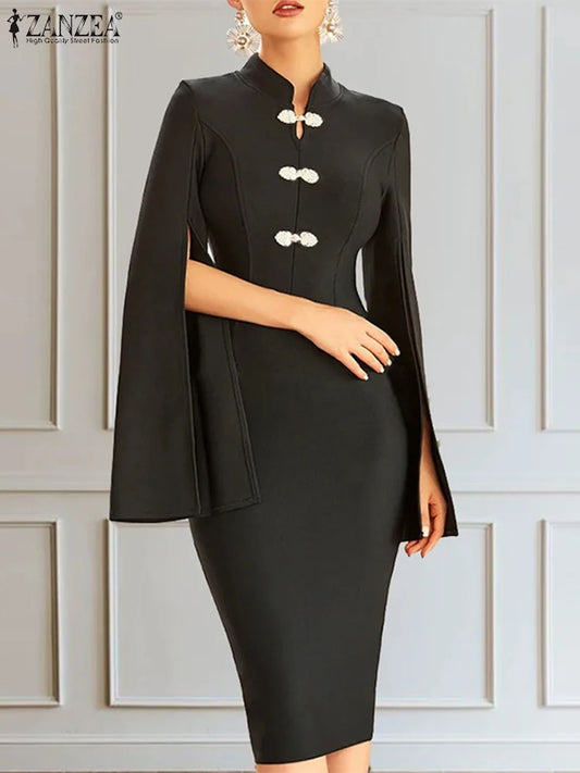 Elegant Stand Collar Long Sleeve Party Sundress ZANZEA Fashion Women Cloak Cape Dress Casual Bodycon OL Work Vestido Robe Femme