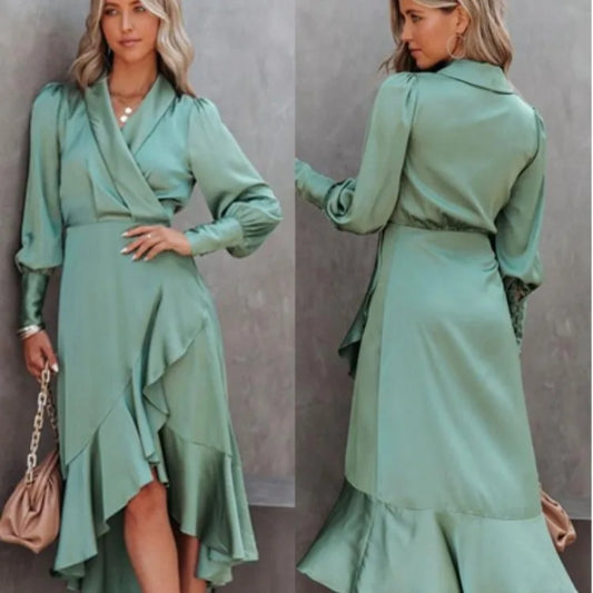2022 New Women Casual Dress Long Sleeve Ruffles Irregular Satin Midi Dress