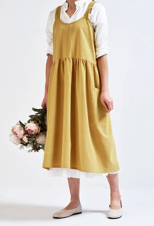 2023 Summer Autumn Women Fashion Cotton Linen Dress Plain Sundress Apron Garden Work Pinafore Dress Loose Pockets Mid-Calf Dress