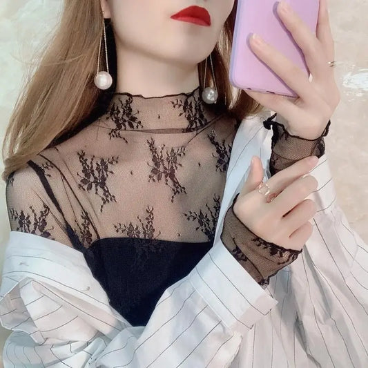Sexy Mesh Lace See Through T-shirt For Women Korean Tops Long Sleeve Floral Print O Neck Tee Tops Bottoming Blouses Streetwear
