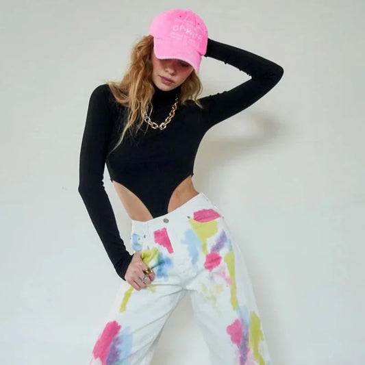 Y2k Europe and America's top women's tights traf fashion round neck long sleeve black tights sexy party nightclub irregular jump