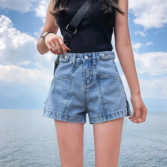 S-5XL Women's Denim Shorts Fashion Vintage High Waist Blue Wide Leg Female Side Zipper Caual Summer Ladies Shorts Jeans