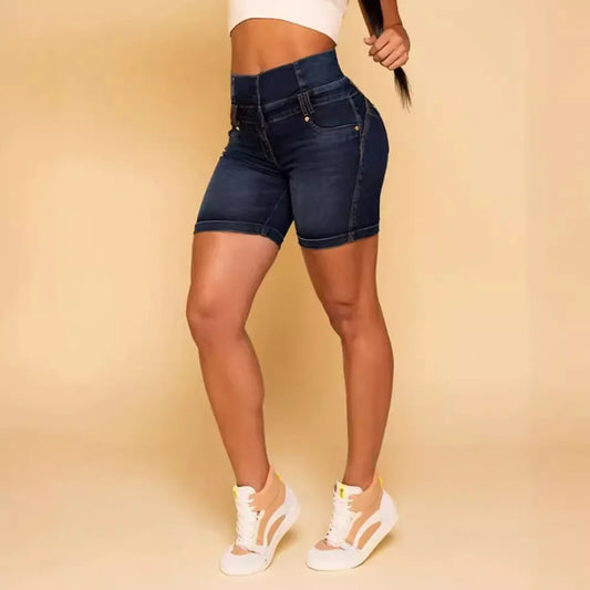 2025 Summer New Women's High Waist Curled Denim Shorts Fashion Casual High Elasticity Slim Knee Length Jeans Shorts