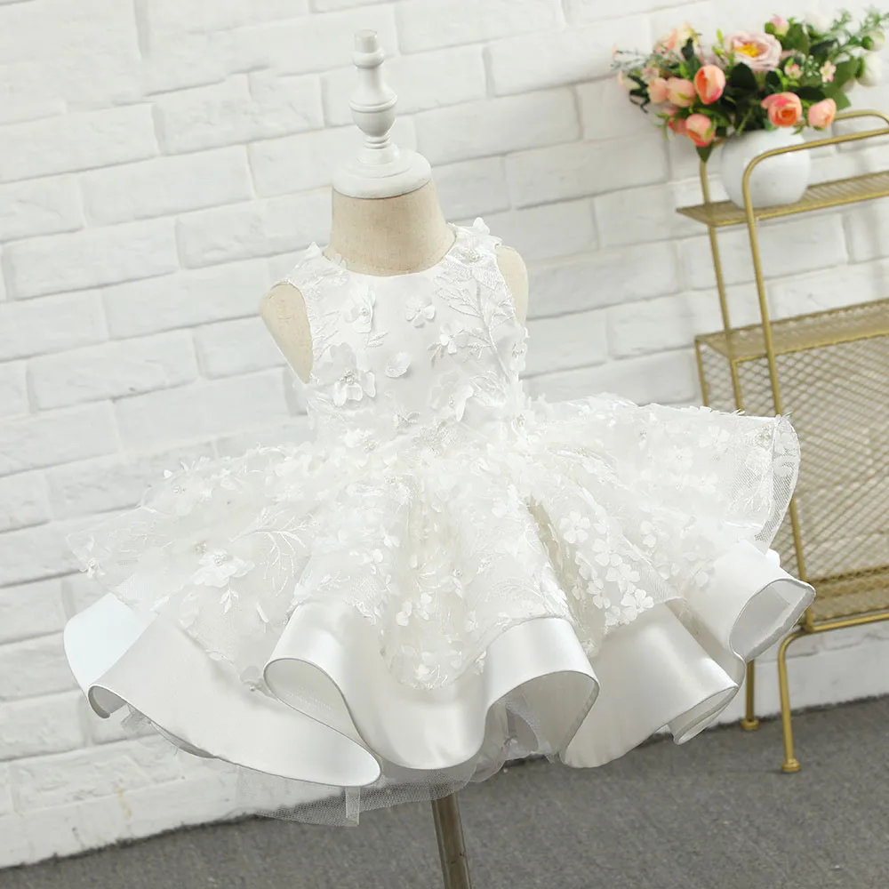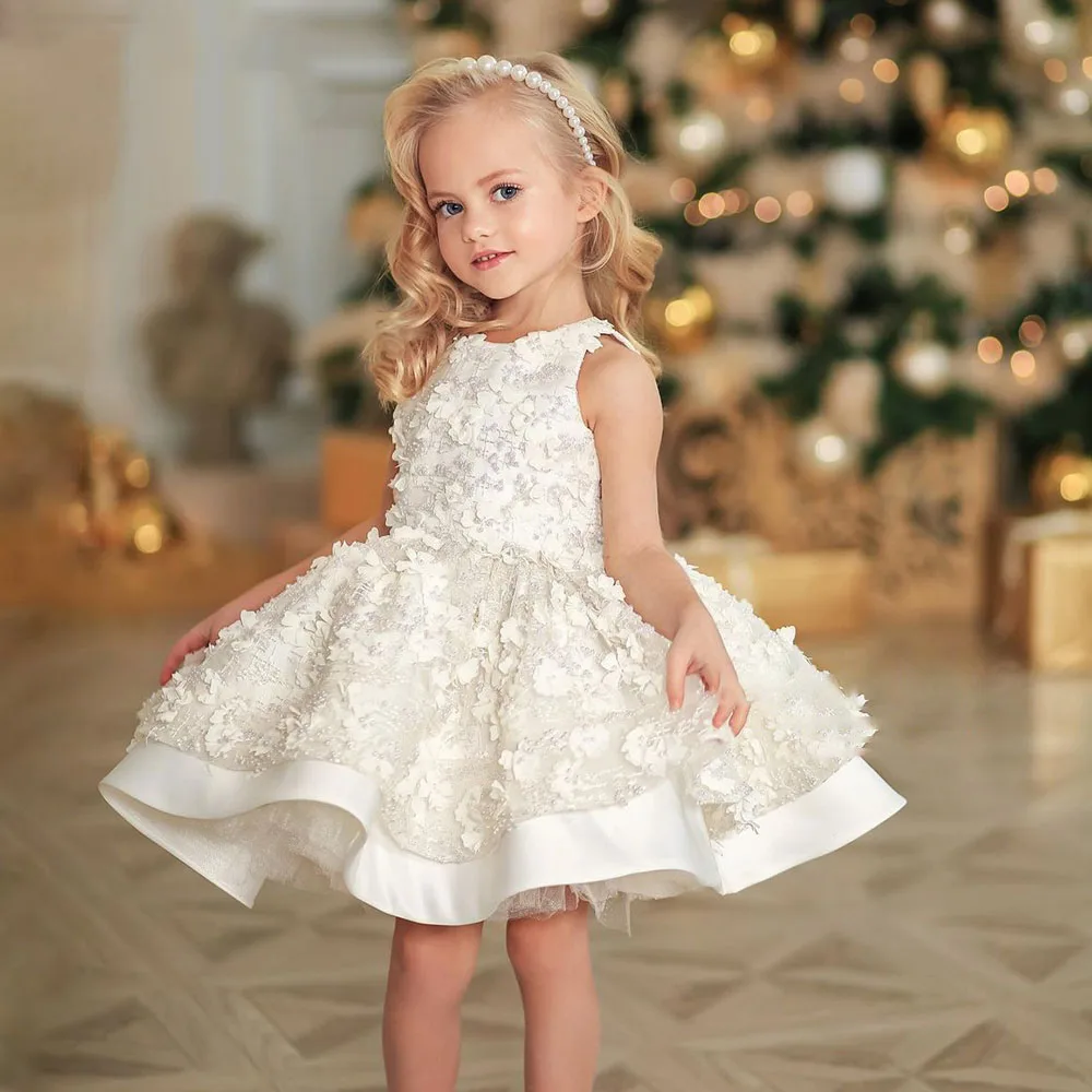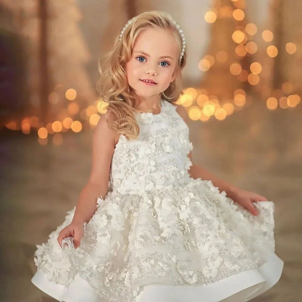 Ivory Flower Girl Dress For Wedding Sleeveless 3d Applique Mini Puffy Kid Birthday Princess Dress First Communion Ball Gowns