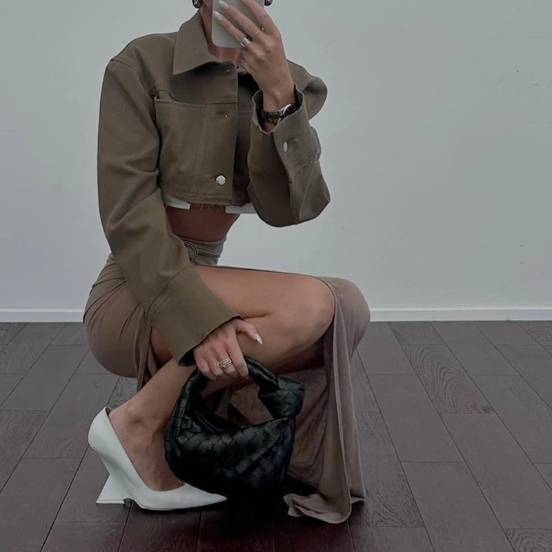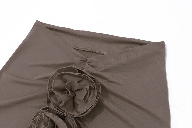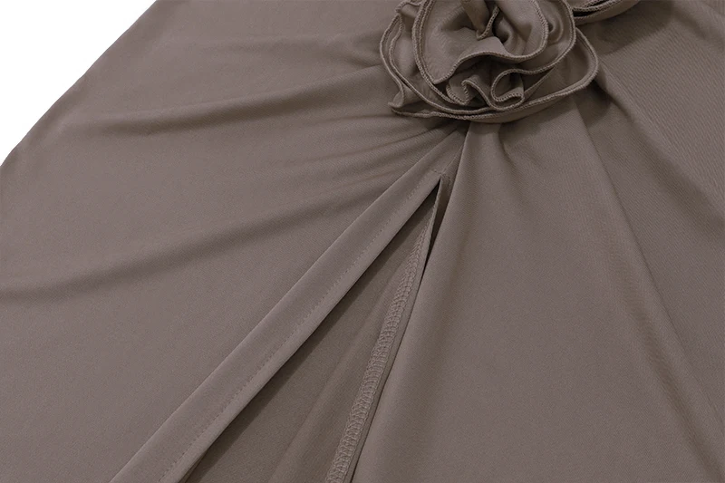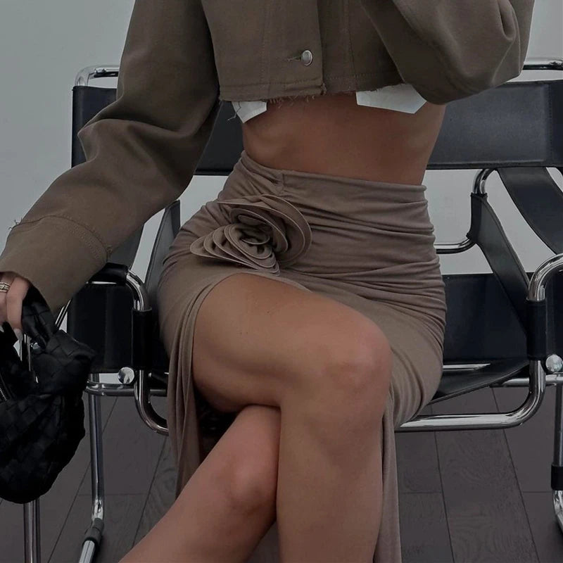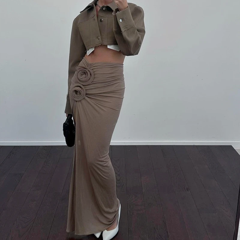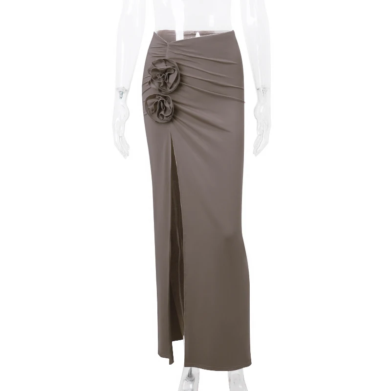 Xeemilo Vintage Flower Applique High Split Long Skirt Sexy High-waist Ruched Solid Slim Skirt Elegant Fashion Women Autumn Skirt