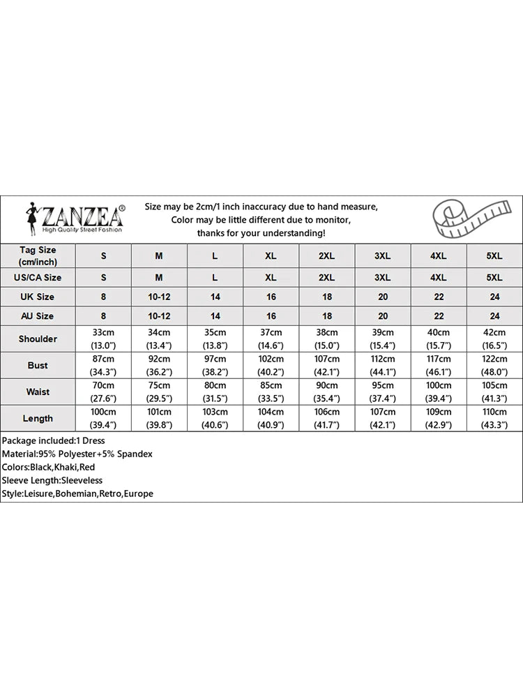 | Package included:1 Dress Material:95% Polyester+5% Spandex Colors:Black,Khaki,Red Sleeve Length:Sleeveless Neckline:V-Neck Pattern:Solid Color Length:Mid-Calf Length Thickness:Thin Decoration:Lace,-Up Style:Leisure,Bohemian,Retro,Europe Season:Spring,Summer,Autumn,Winter Occasion:Family,Party,Beach,Wedding,Holiday,Employment Label: Yes Attentions: 1.The Real Object May Exist Slightly Colors Differences Compared To Images As Different Computers Display.Caution If Minding,Thanks. 2.There Might Be A Manual Measuring 1-3 cm Error.Sorry For Any Inconvenience. 3.Please Prevail On Real Item, Model Images For Reference Only. 4.Attention!!!Please check the size chart carefully before placing the order.