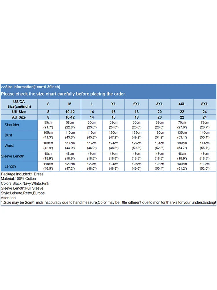 Material:100% Cotton Colors:Black,Navy,White,Pink Size:S,M,L,XL,2XL,,, Sleeve Length:Full Sleeve Neckline:Turn-Down-Collar Pattern: Solid Color Length:Mid-Calf Length Buckle chain:Button Down Front,Button Cuffs Thickness:Thin Style:Leisure,Retro,Europe Season:Spring,Autumn,Winter Occasion:Family,Party,Beach,Wedding,Holiday,Employment