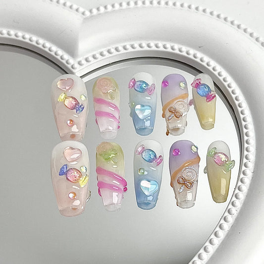 10pcs handmade dark sweet y2k fake nails with glue pink star press on nails long shiny hot girl designs false nails with tools