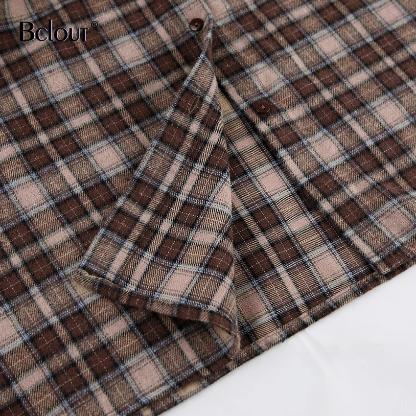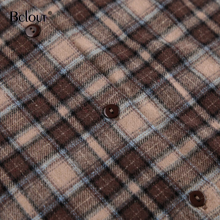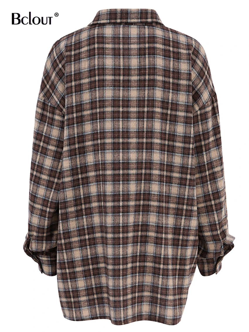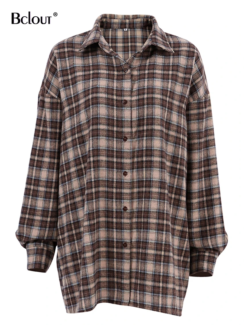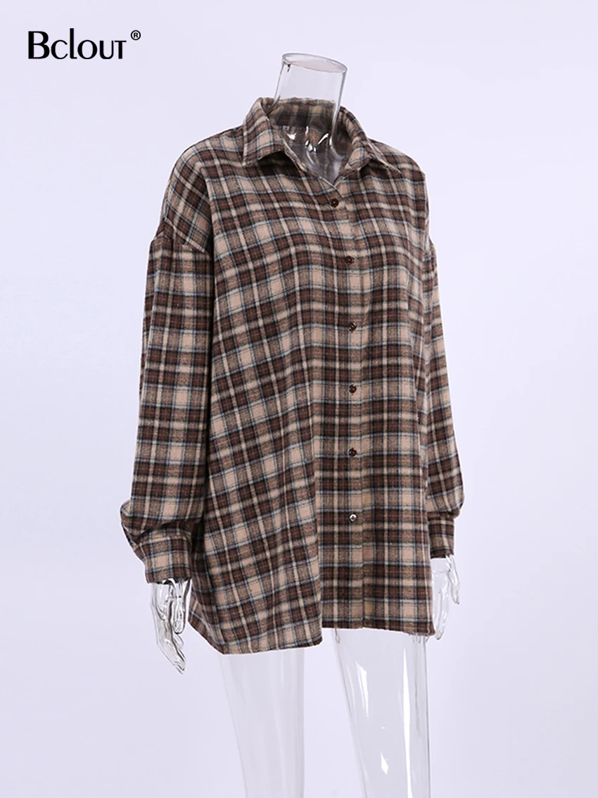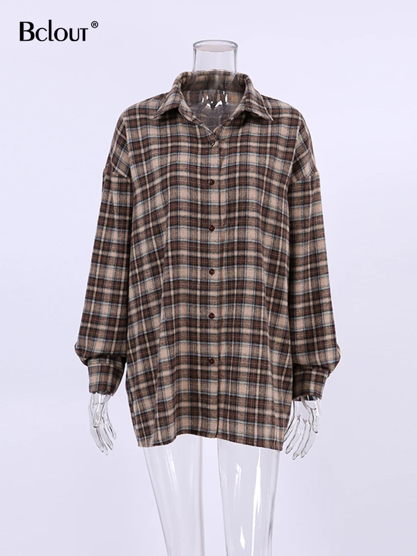 Bclout Fashion Brown Plaid Blouses Women 2024 Streetwear Long Sleeve Loose Shirts Casual Turn Down Collar Office Lady Plaid Tops