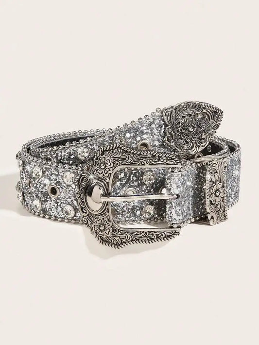 Women Sequin & Rhinestone Decor Geometric Buckle Fashion Belt For Dress Decoration