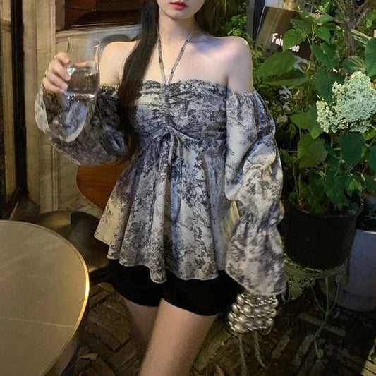 Women Sexy Off Shoulder Backless Halter Drawstring Blouse Spring Summer Trendy Print Chic Shirt Long Sleeve Slim Y2K Tops Blusas