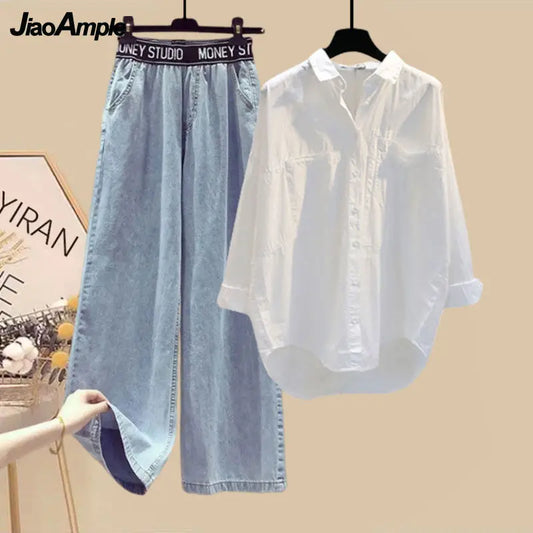Women Summer New White Sunscreen Shirt Top+Striped Vest+Wide Leg Jeans 3 Piece Suit 2024 Korean Elegant Denim Pants Matching Set