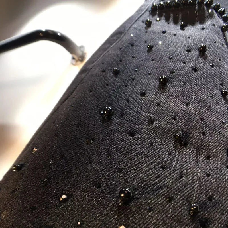 European Black Lace Denim Pants, 2025 Summer New Heavy Industry Beads Hot Diamond Denim Splicing Crochet Hollow Lace Jeans Women