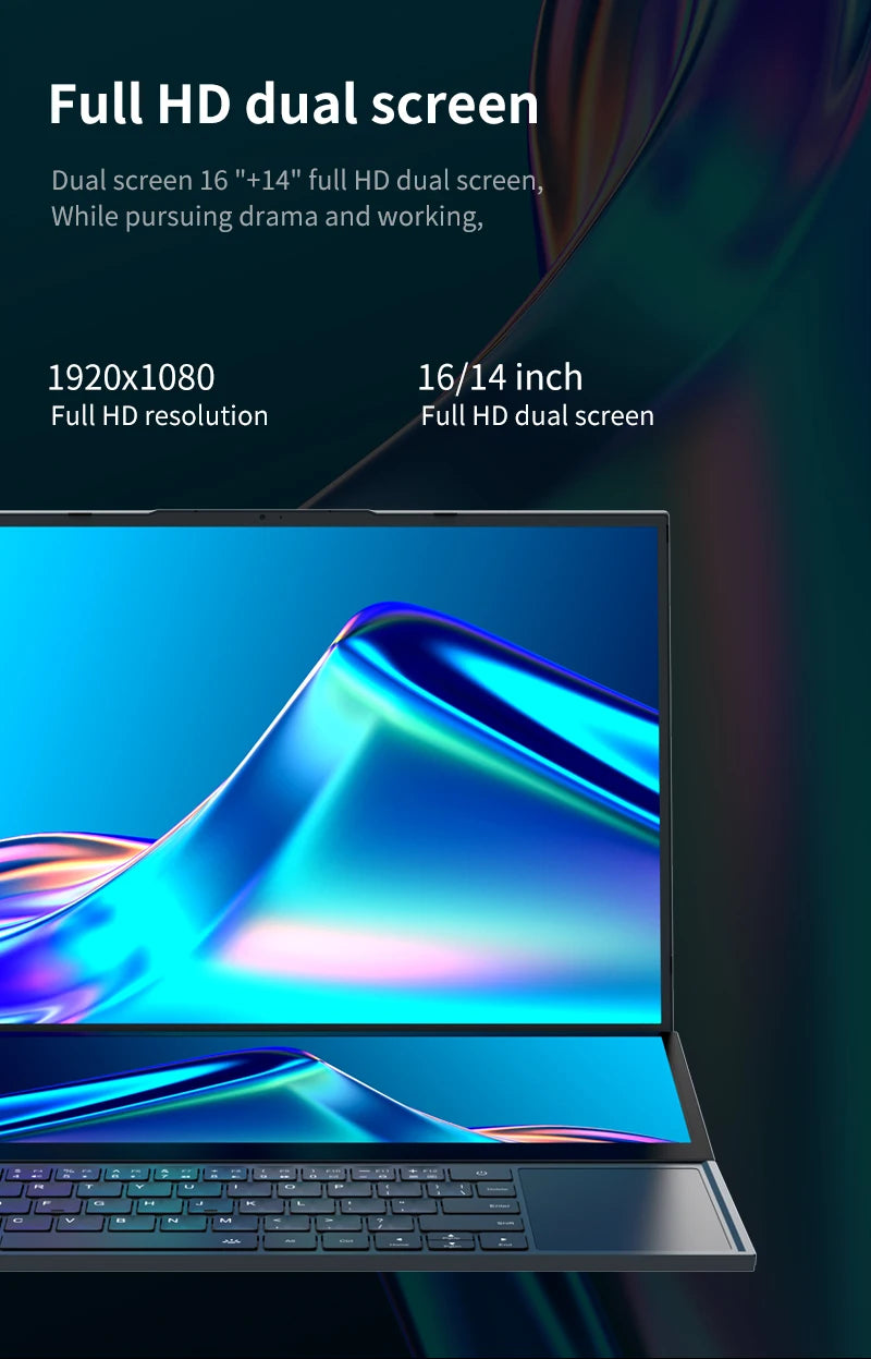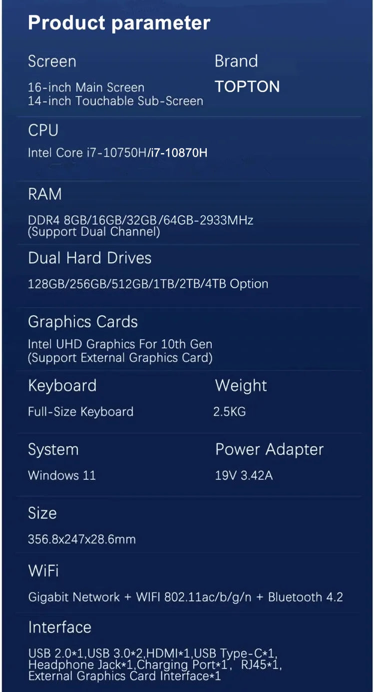 Topton Dual Screen Gaming Laptop 16 Inch IPS + 14'' Touch Intel i9-10885H I7-10750H Max 64GB 4TB Slim Notebook Gamer PC Computer