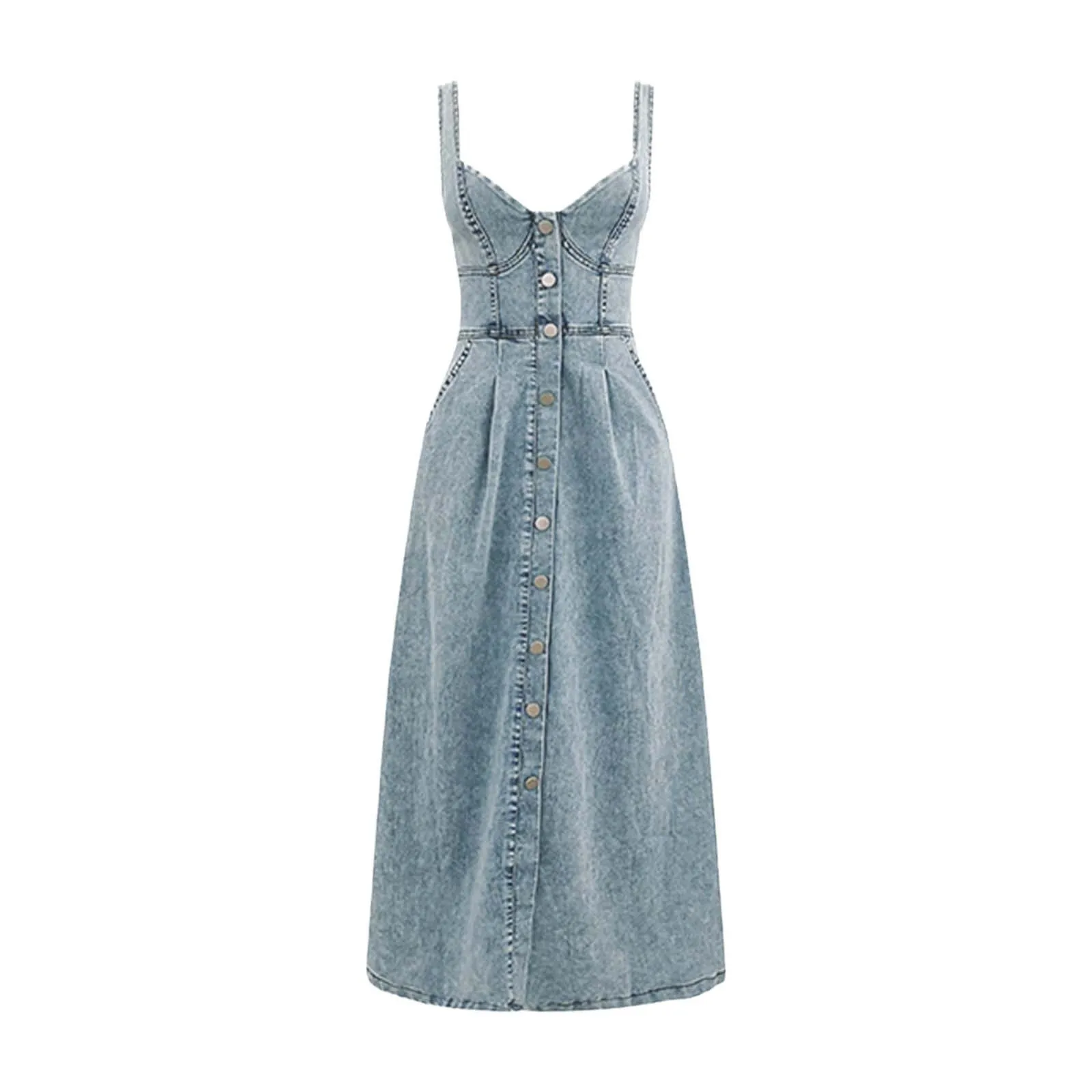 Vintage Sleeveless Denim Maxi Dress with Front Buttons, Casual Summer Style