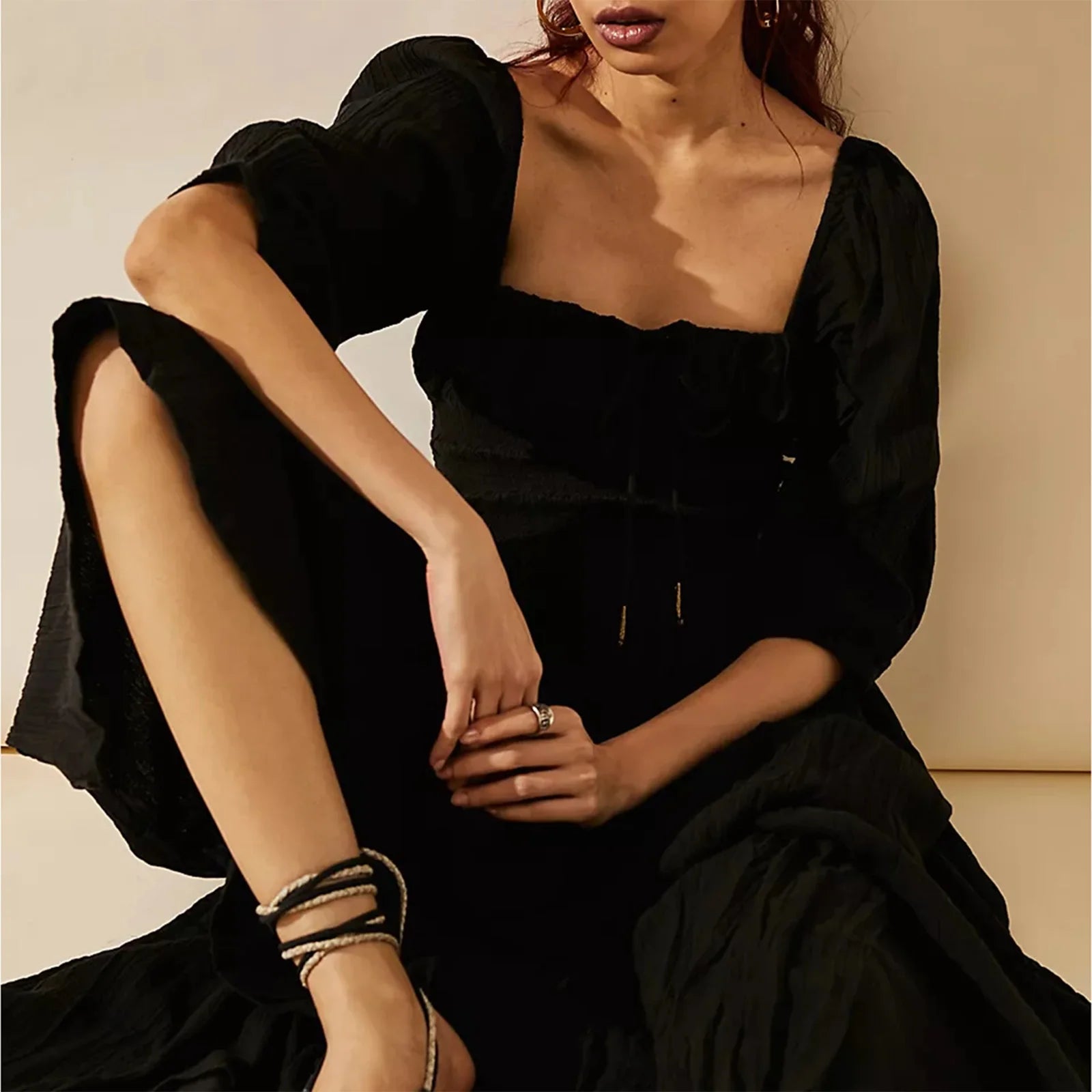 Women's Midi Dress Flowy Silhouette Ruffled Necklin High Split Dress with a Smocked Adjustable Tie at Bustline Fairycore Dresses