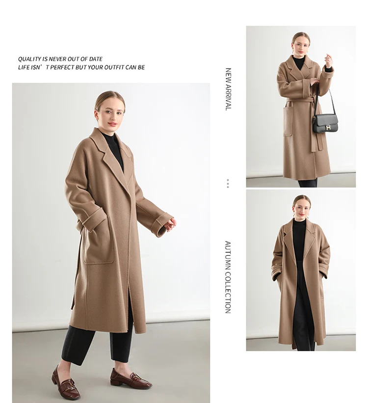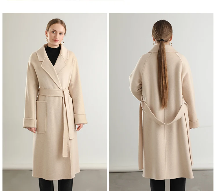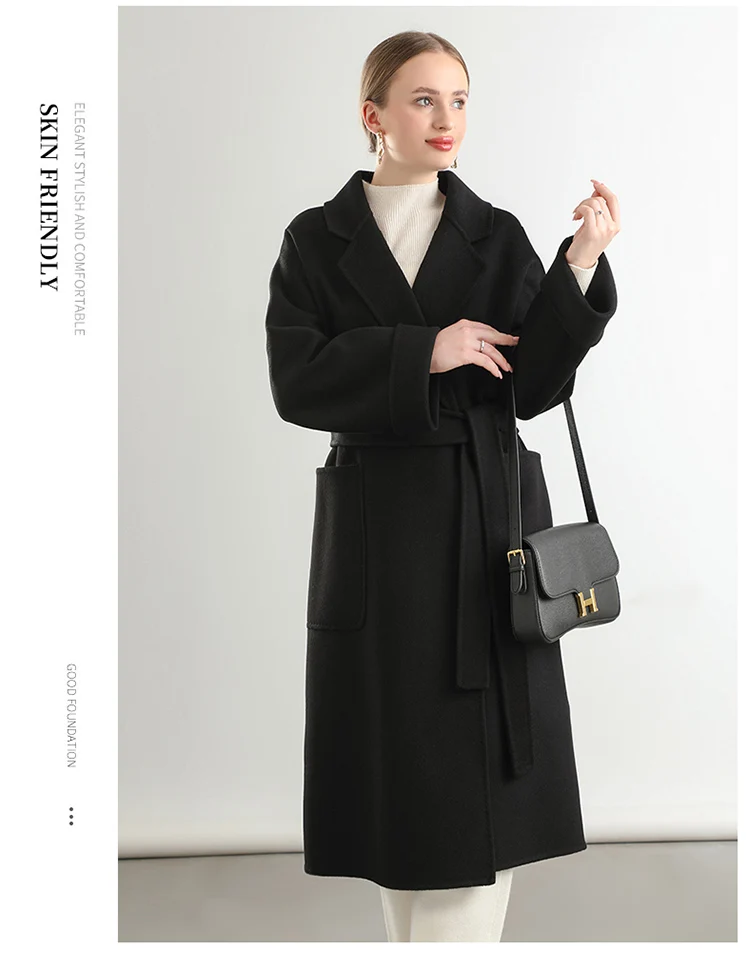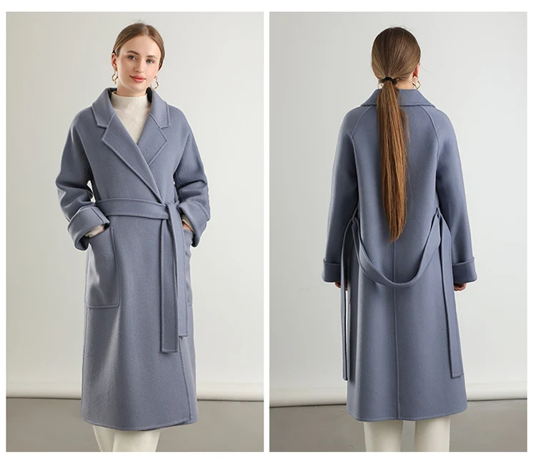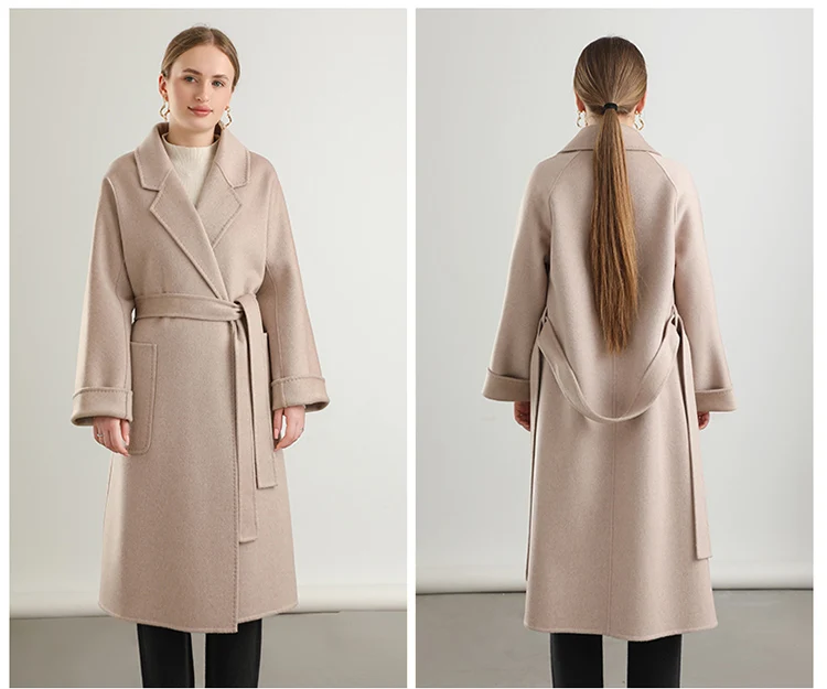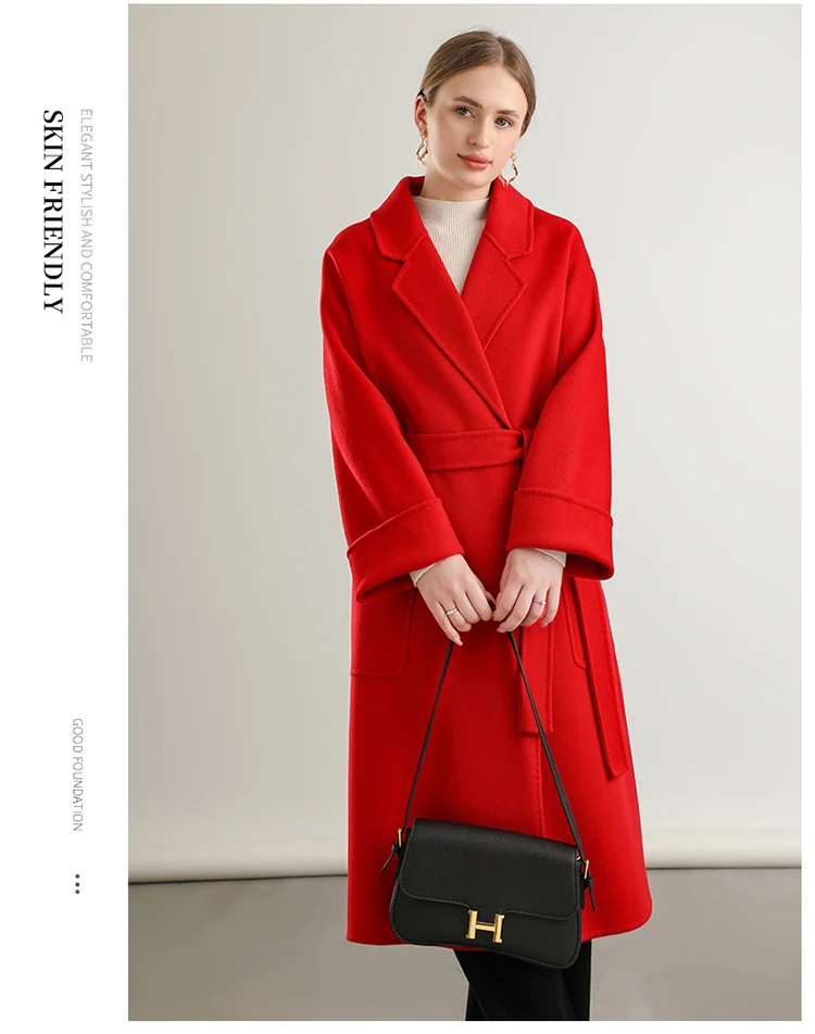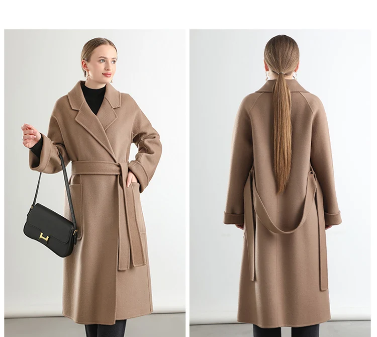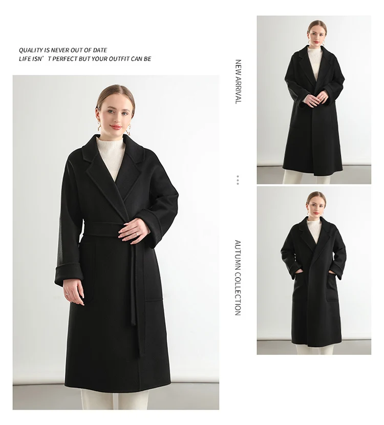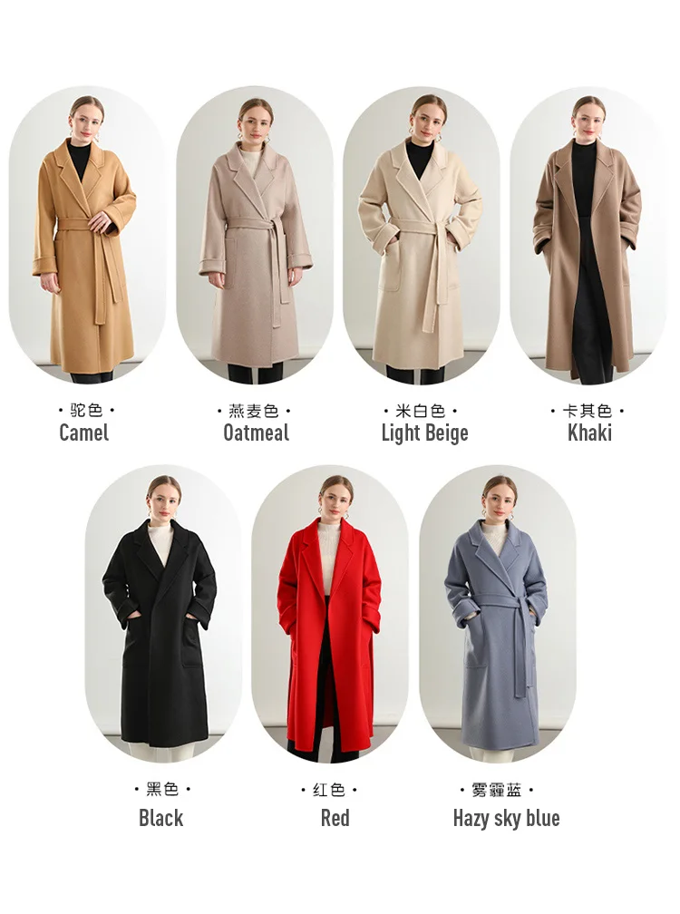 100% Real Wool Long Belt Warp Women Overcoat Classic Model Fall Winter Turn-down Collar Dense Fabric Narrow Notch Lapel Coat #08
