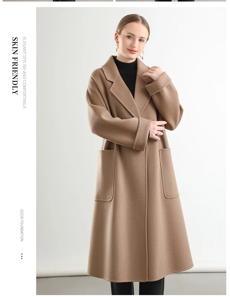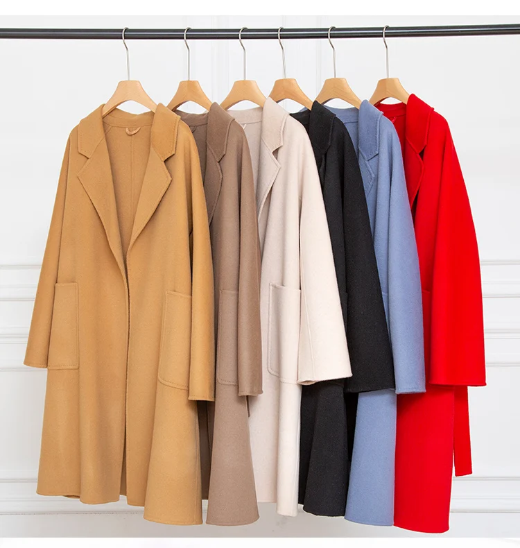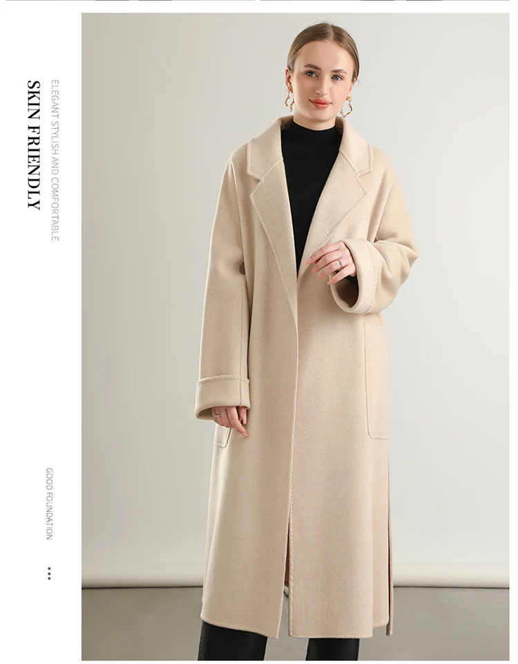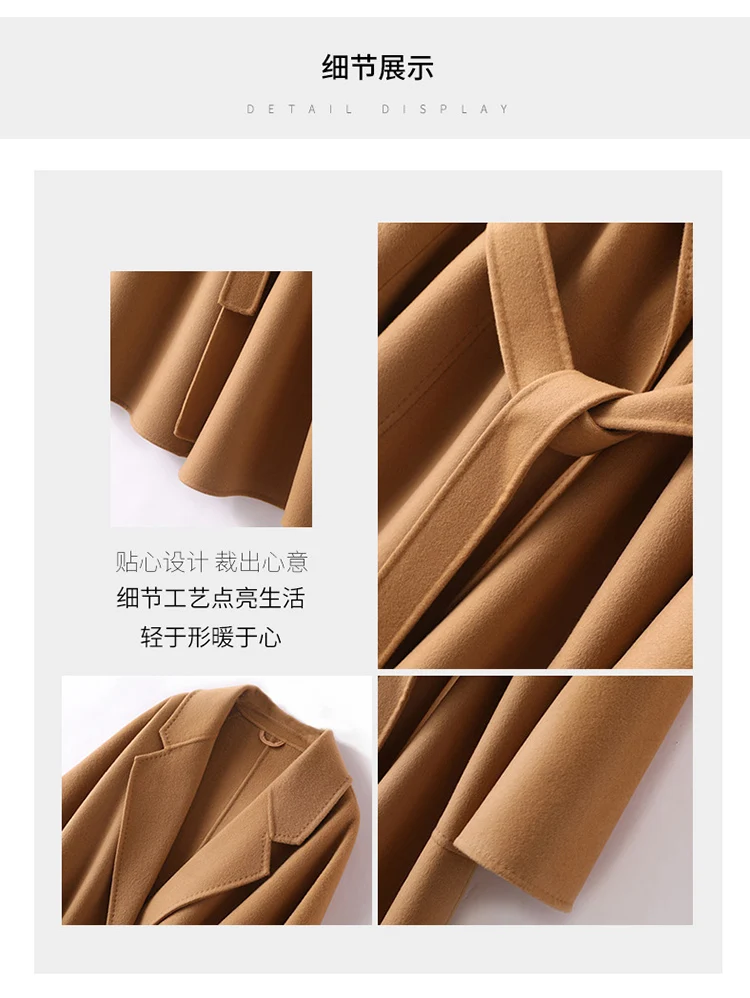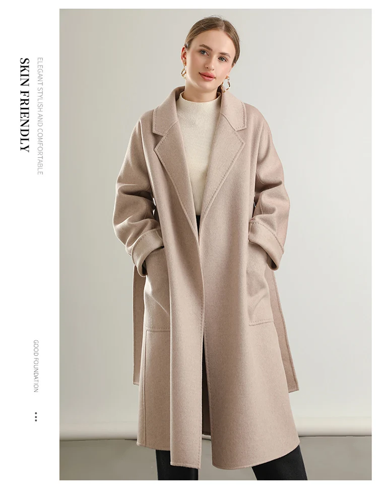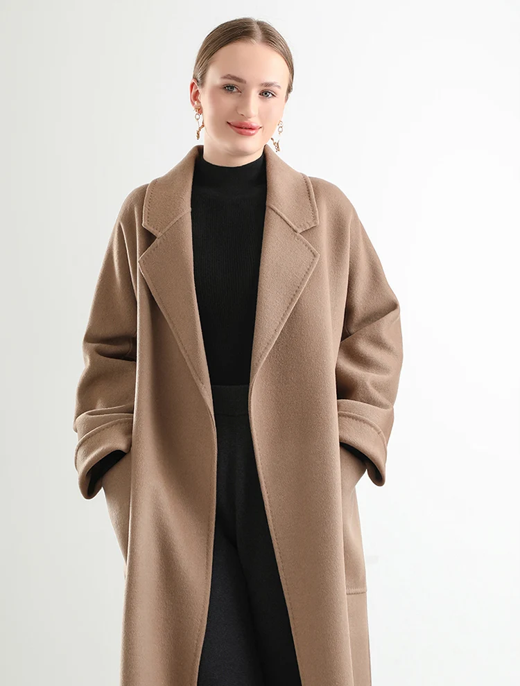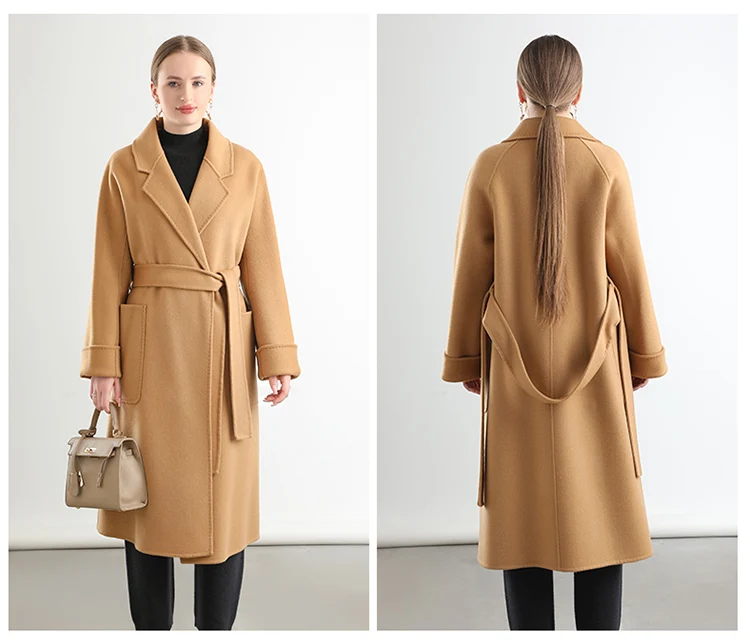 100% Real Wool Long Belt Warp Women Overcoat Classic Model Fall Winter Turn-down Collar Dense Fabric Narrow Notch Lapel Coat #08