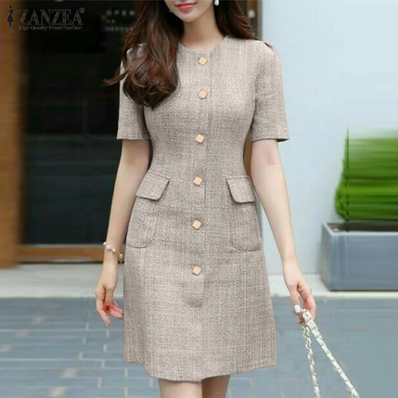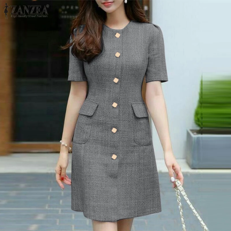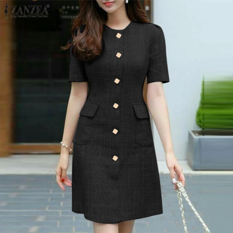 2023 ZANZEA Fashion Slim Dresses Summer OL Work Dress Women O Neck Party Sundress Short Sleeve Buttons Up Vestidos Robe Sarafans