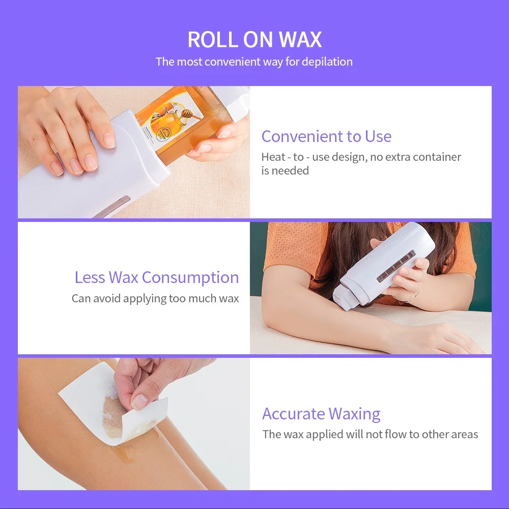 1.Compatible with Roll On Wax. The wax is ultra-easy to use. You can simply insert one into our heat, heat it, wait a few minutes and then apply the heater directly on skin. No extra container or operation is needed.