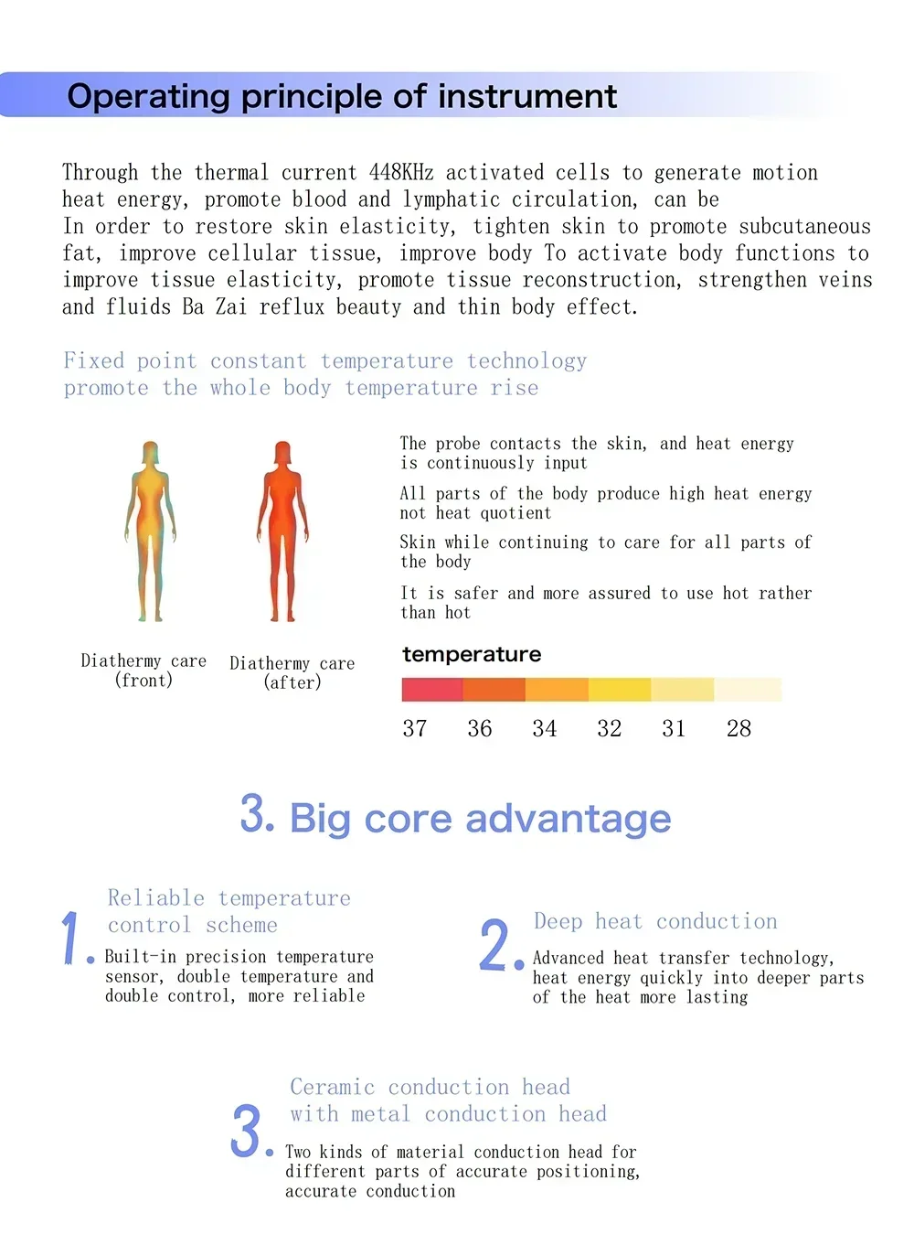 1. Through 448Khz thermal current, activated cells to generate motion thermal energy, promote blood and lymph circulation, can restore skin elasticity, tighten skin to promote subcutaneous fat, improve tissue cellular, improve the body Activate body functions to improve tissue elasticity, promote tissue reconstruction, Strengthen veins and fluids Ba Zai reflux beauty and slim body effect.