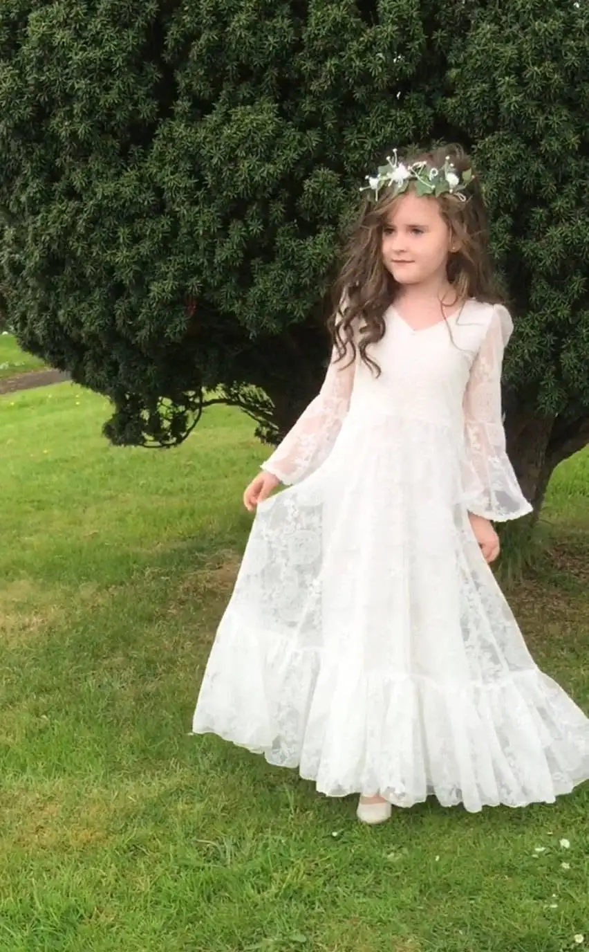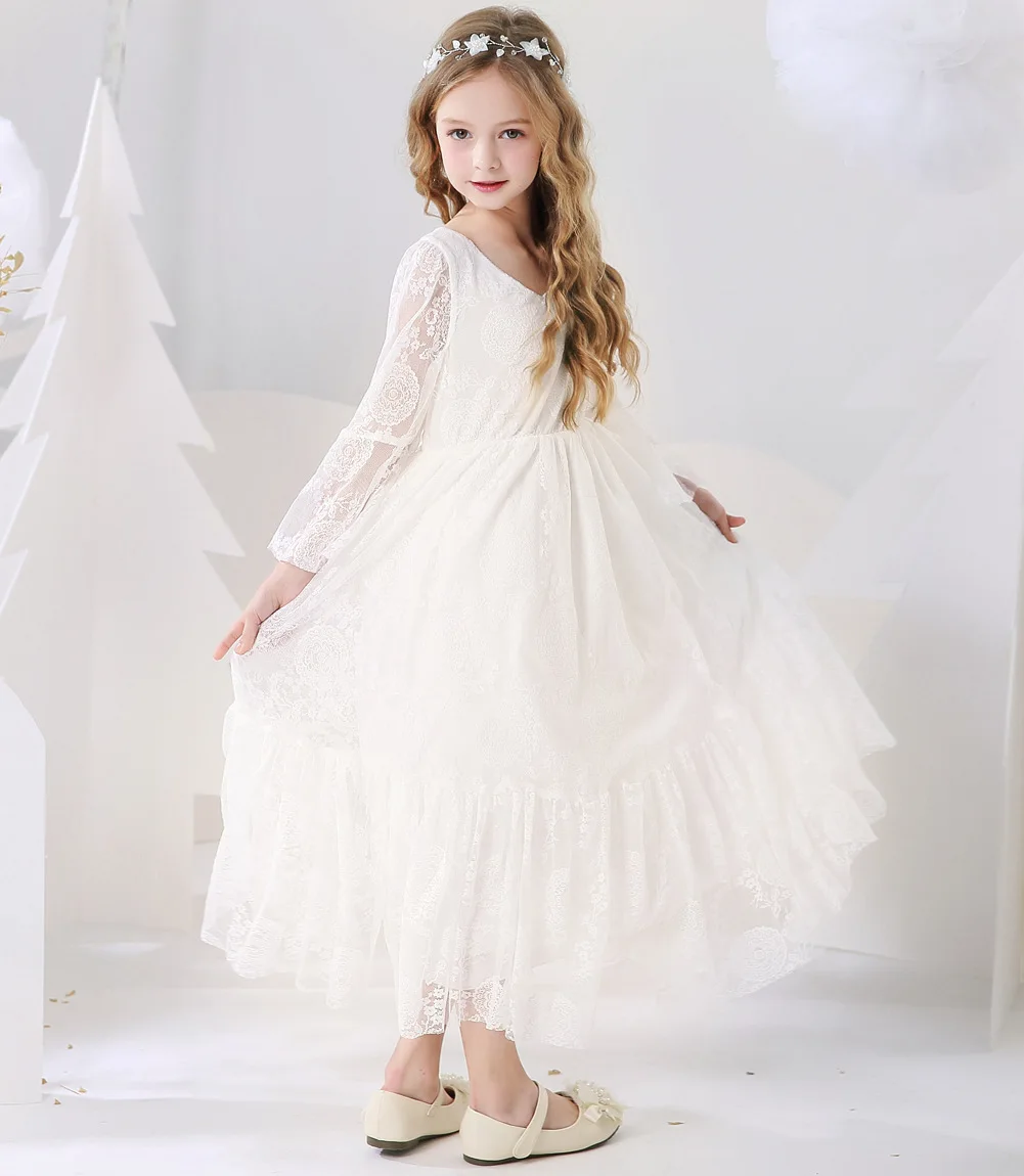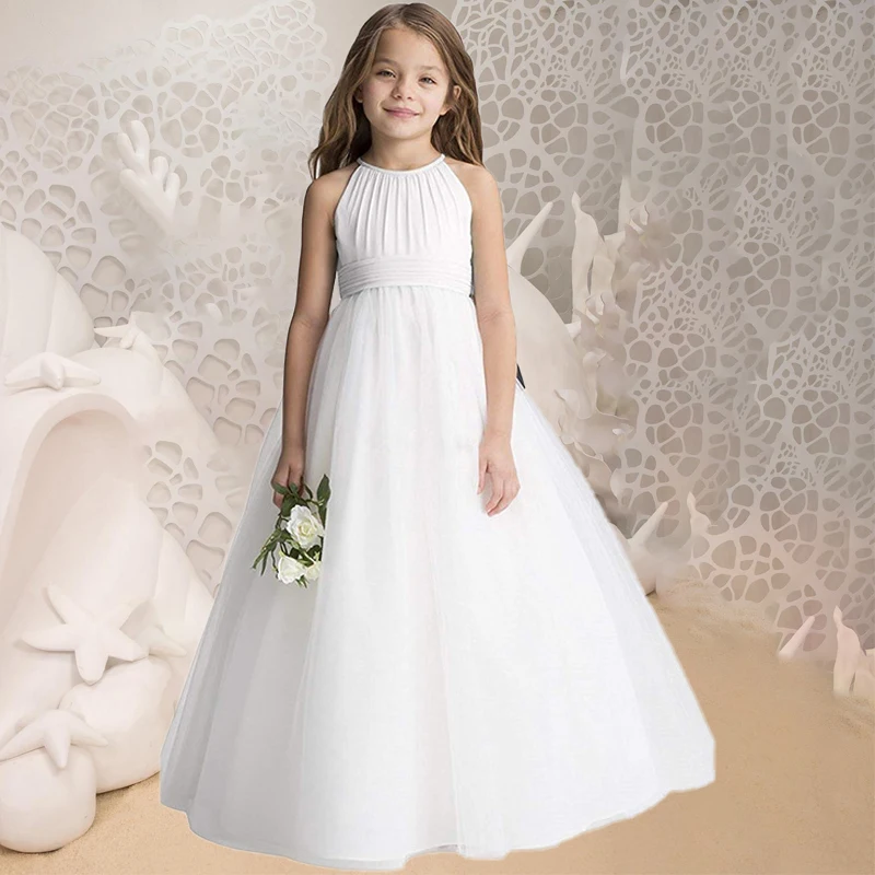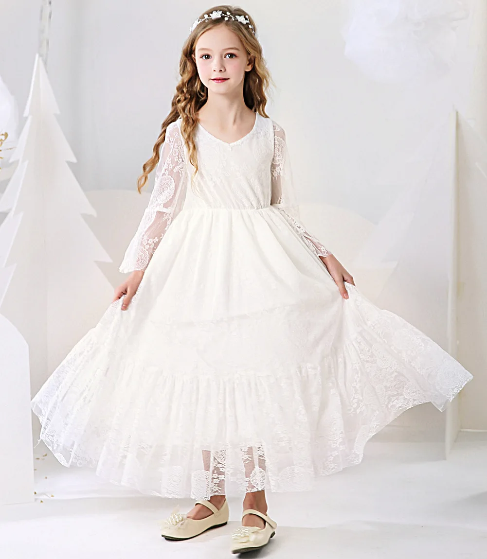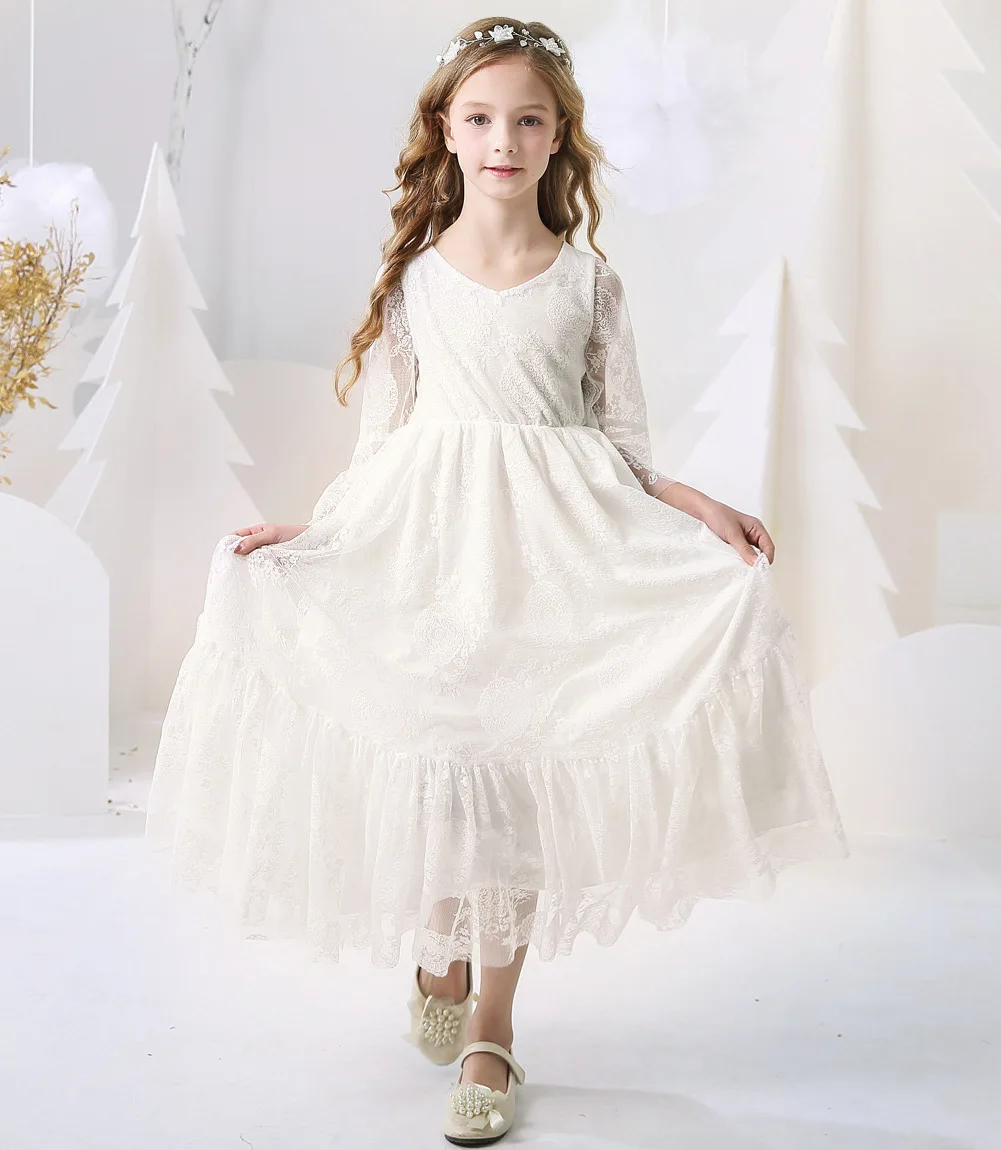 Princess Girls Lace Chiffon Long Dresses Kids Flower Girl Wedding Dress Summer Boho Birthday Party Wedding Dress For 2-14 Years