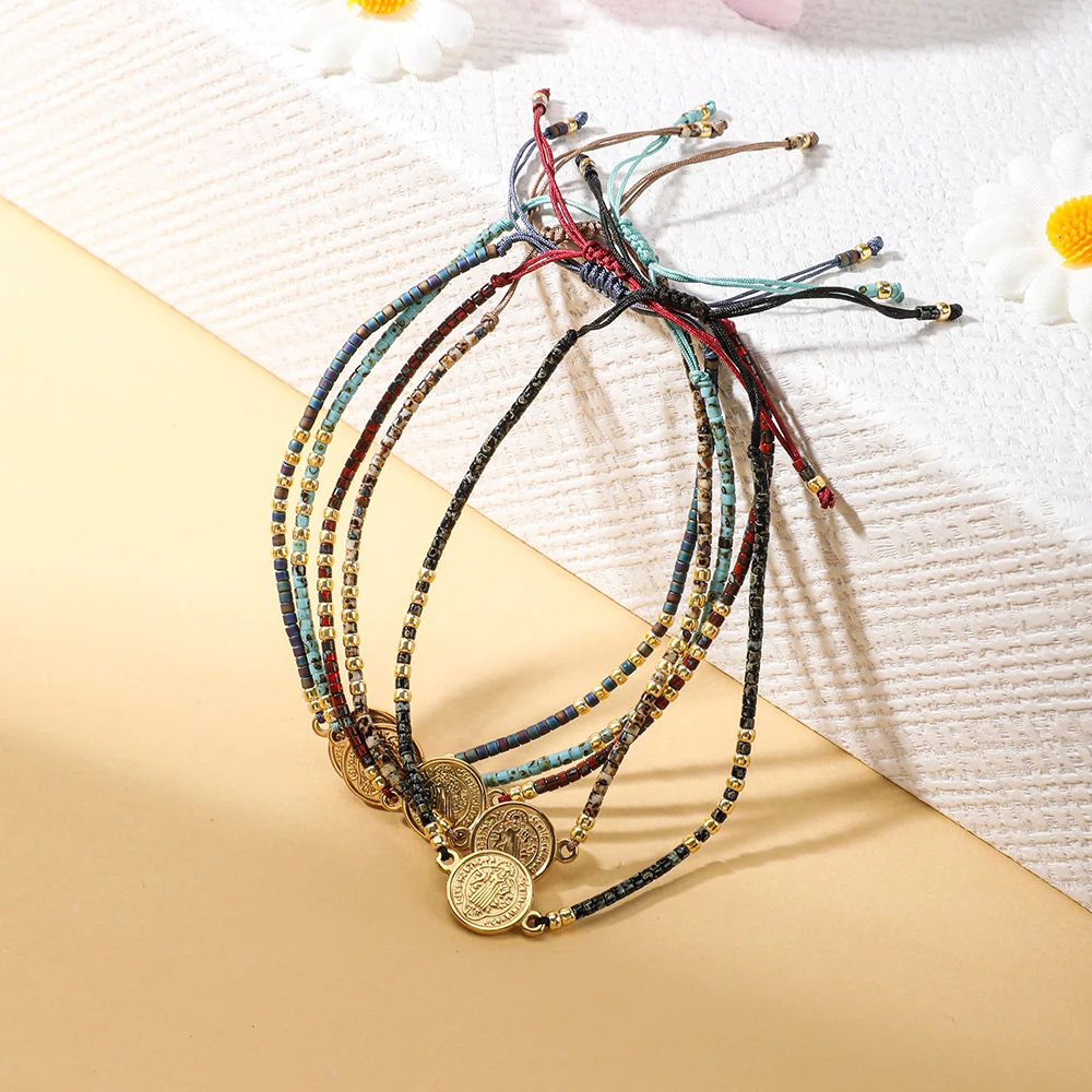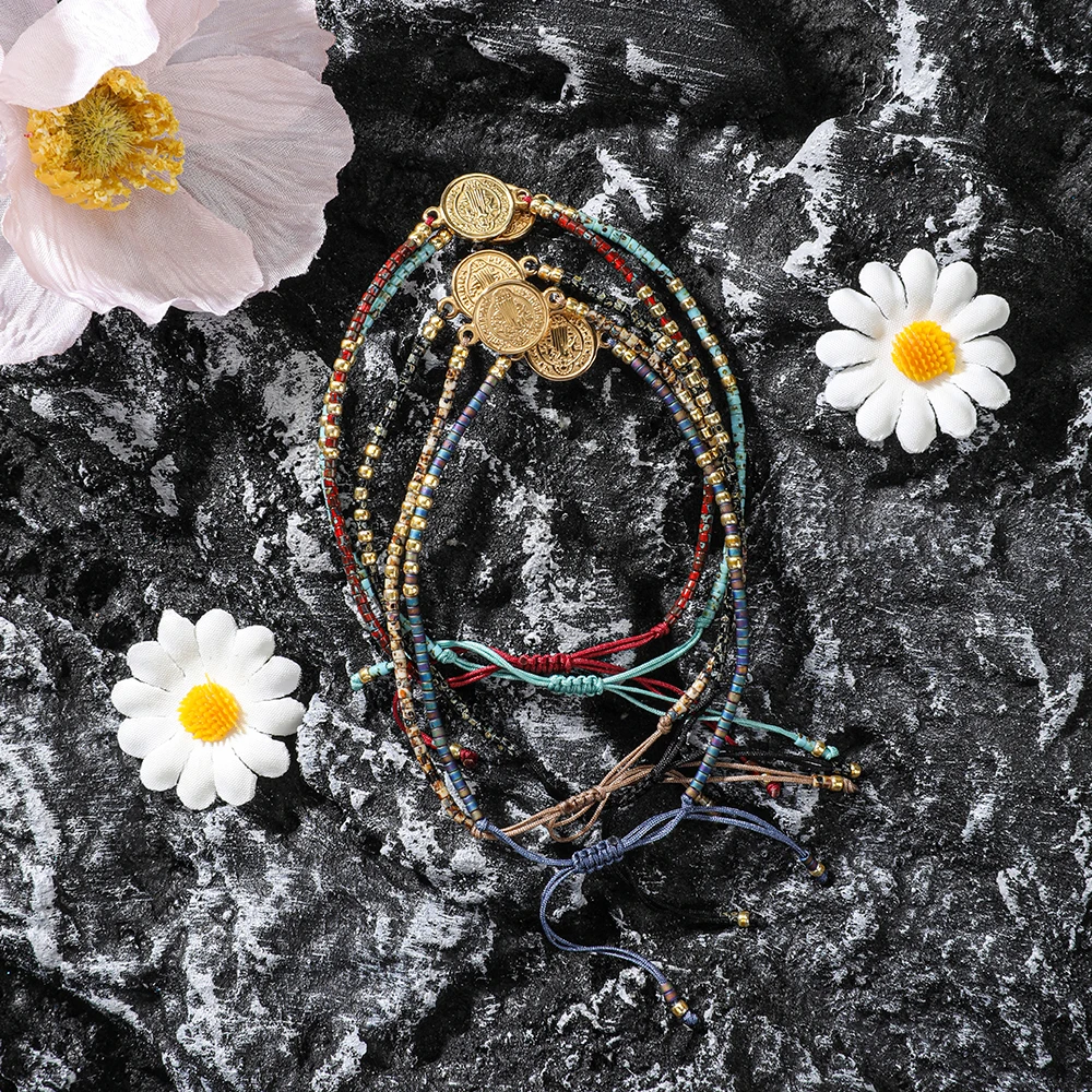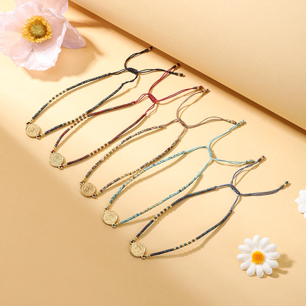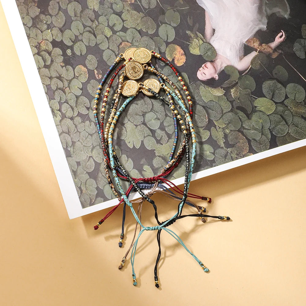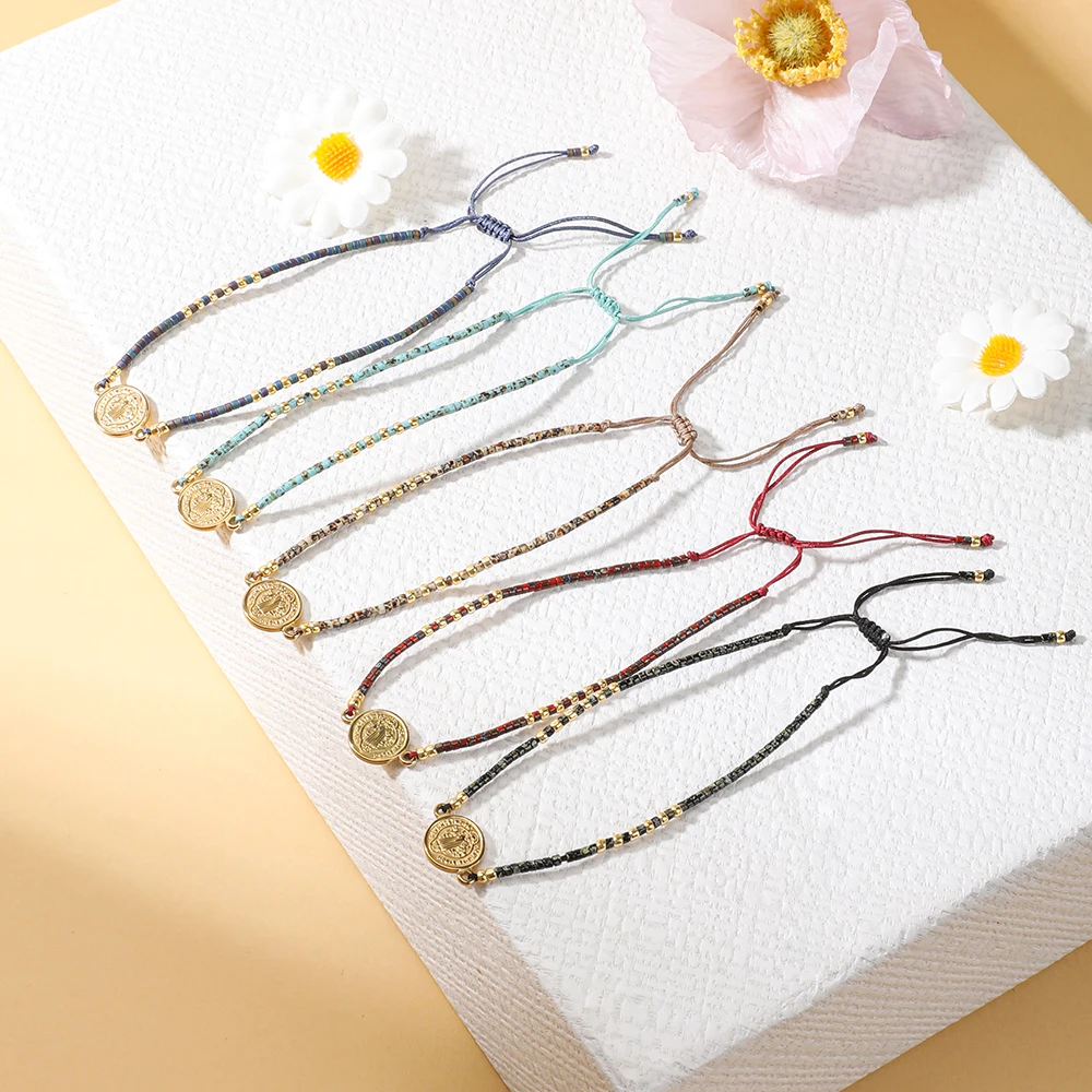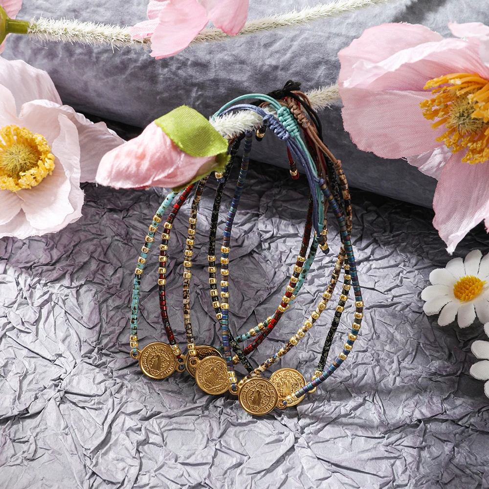 Vintage Gold Color Coin Bracelet Glass Beads DIY Thin Rope Bracelets for Women men Jewelry