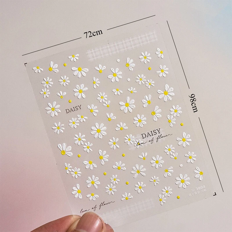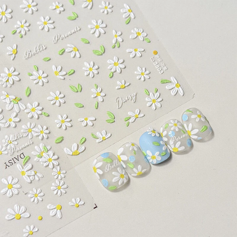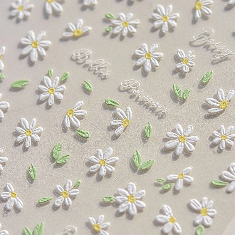 1pc Embossed White Daisy Flower nail Sticker 3D Spring Summer self-adhesive slider Nail Art Decoration Manicure DIY Decals