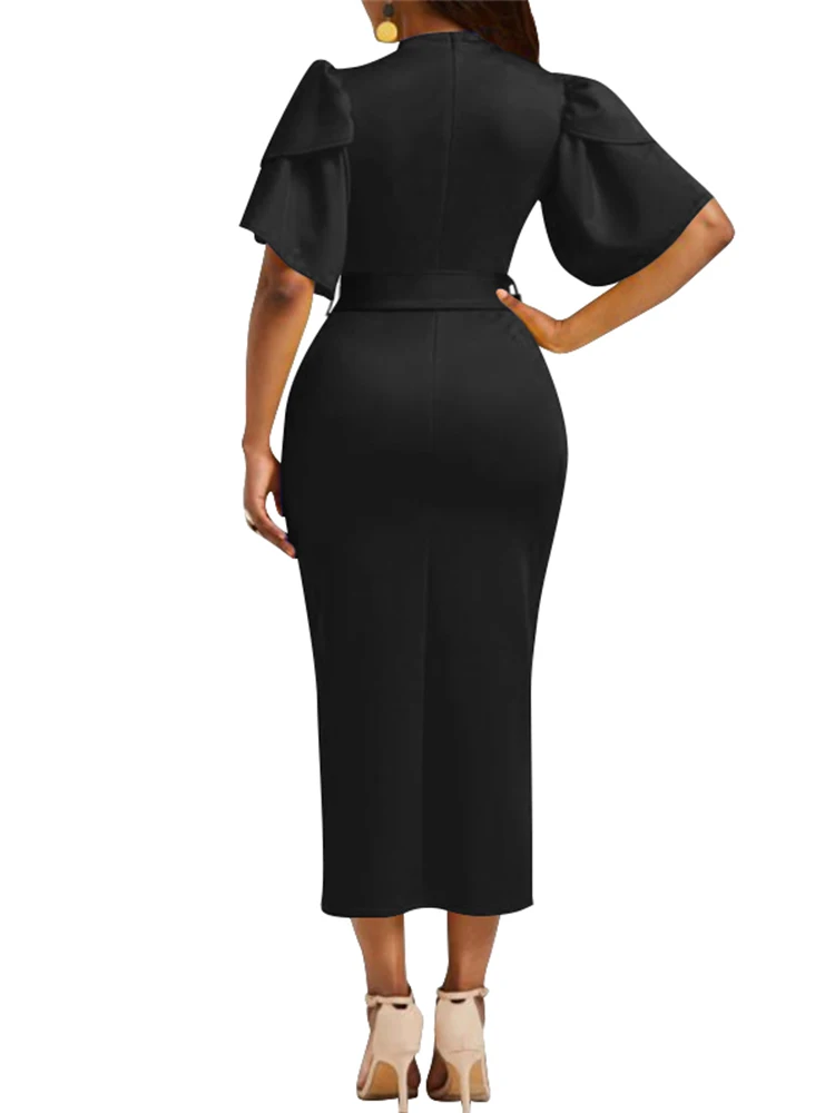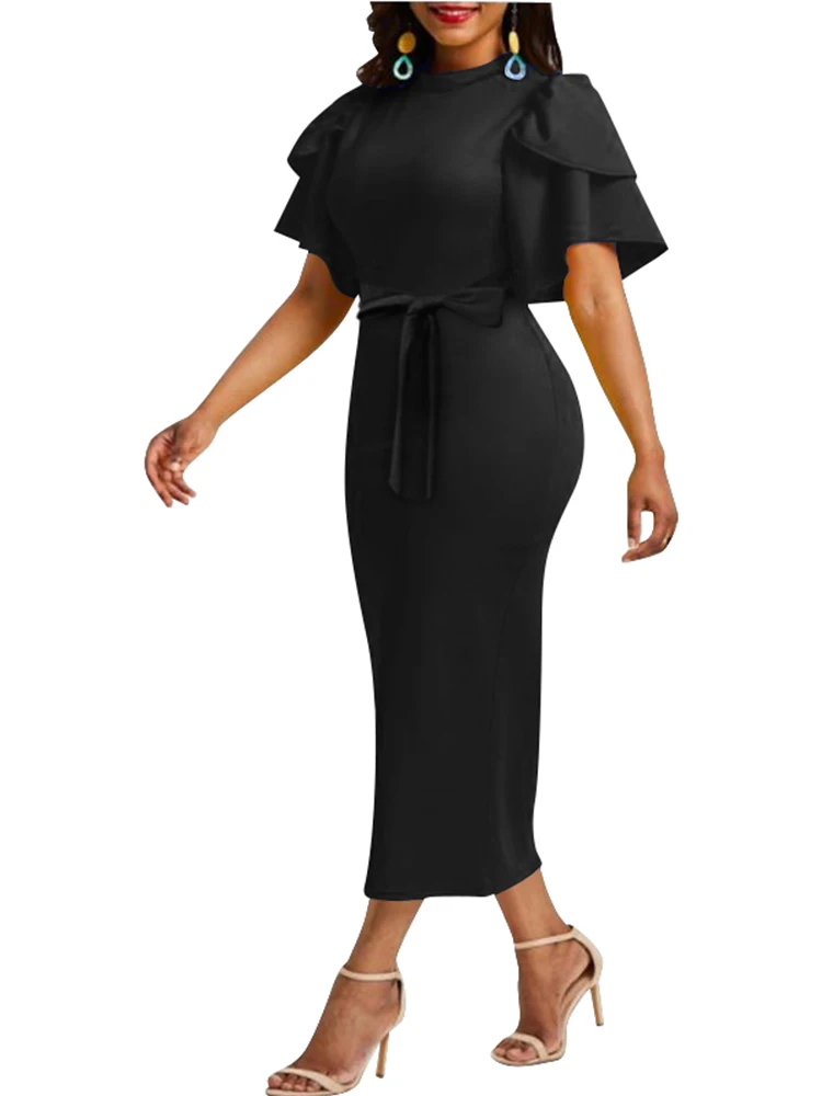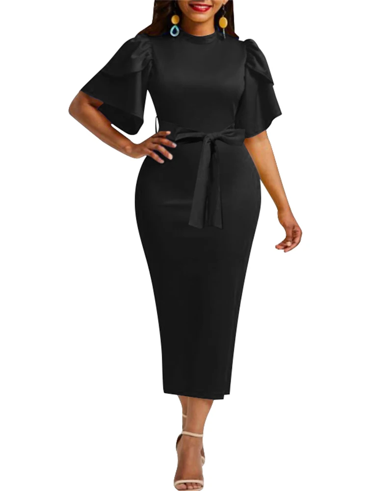 2023 Summer Dresses for Women Round Neck Lace Up Ruffle Sleeve Work Dress Vestidos De Mujer Casual Elegant Midi Robe Female