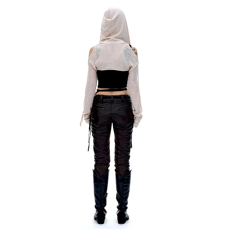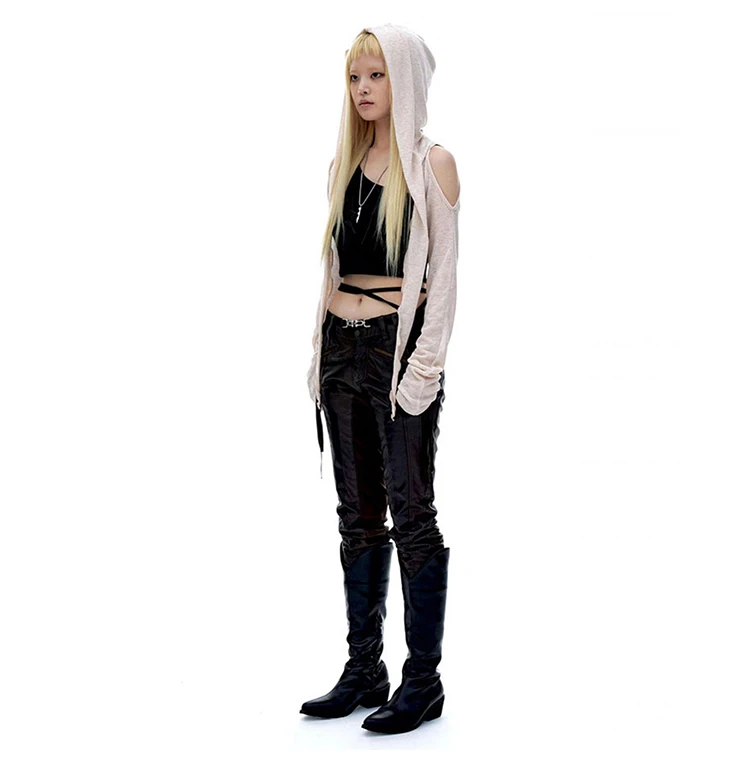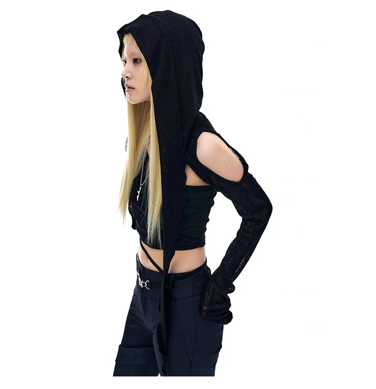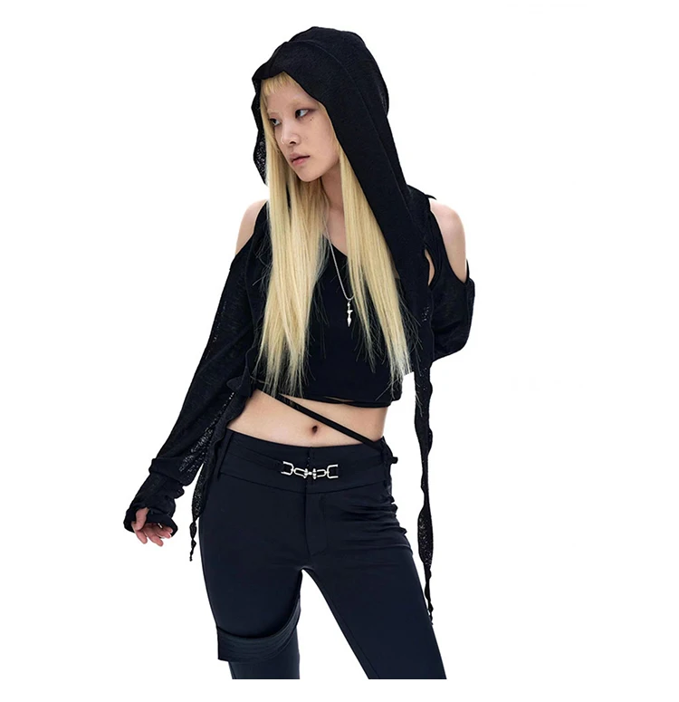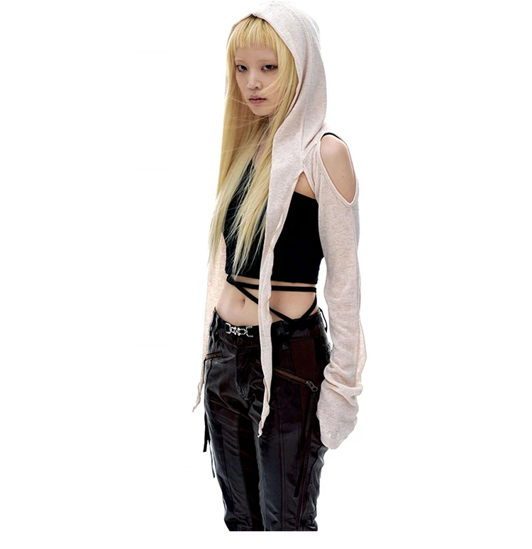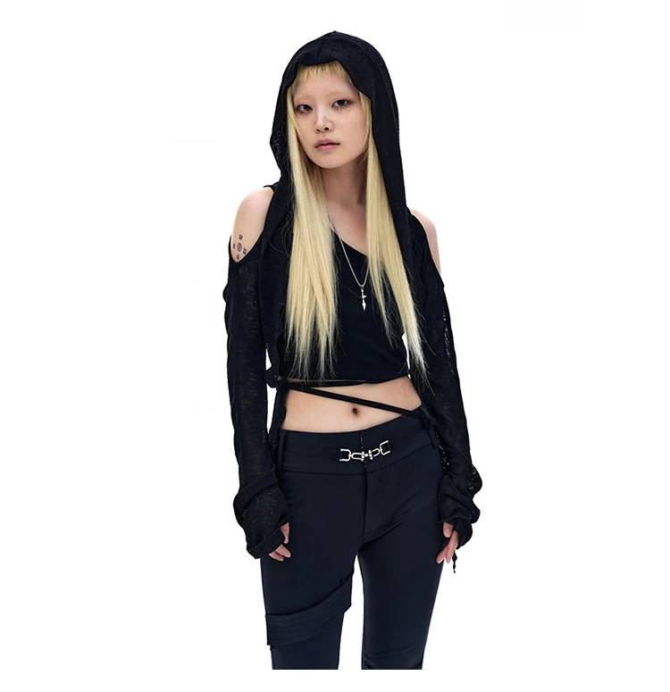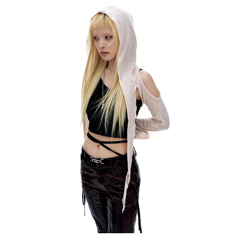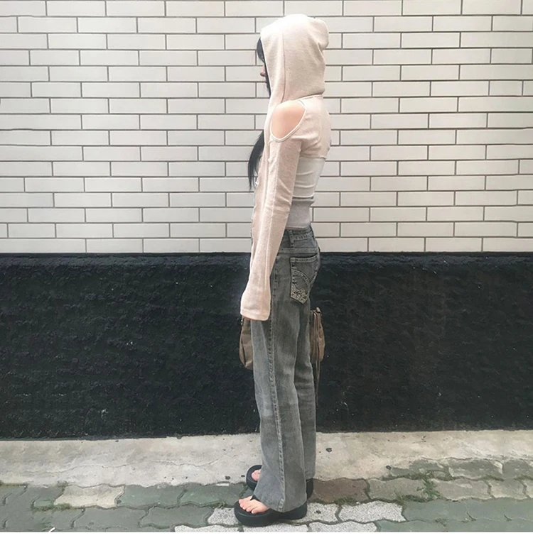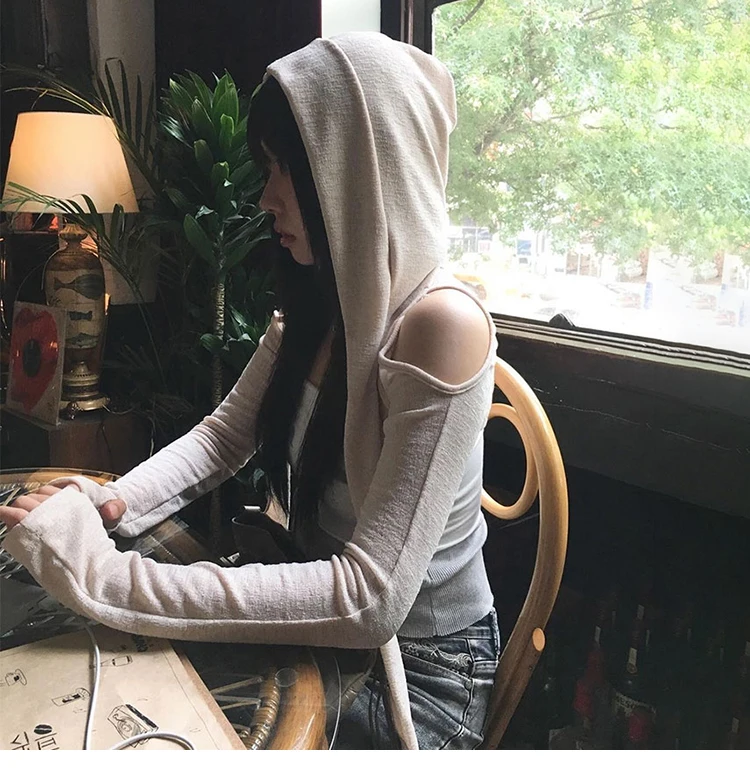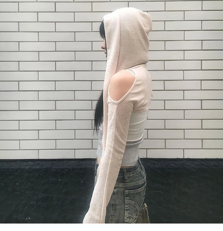2024 Long Sleeve Hooded T-shirts Off Shoulder Sexy Harajuku Tshirts Women Y2k Aesthetic Grunge Streetwear Crop Top Thin Cardigan