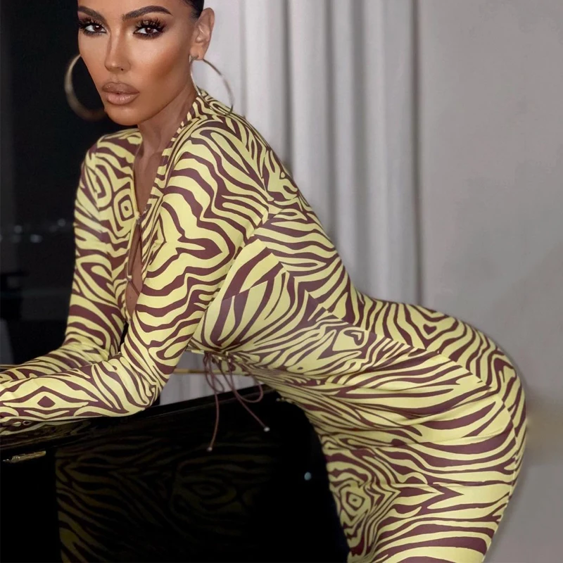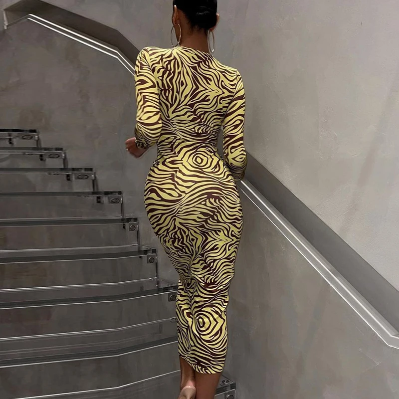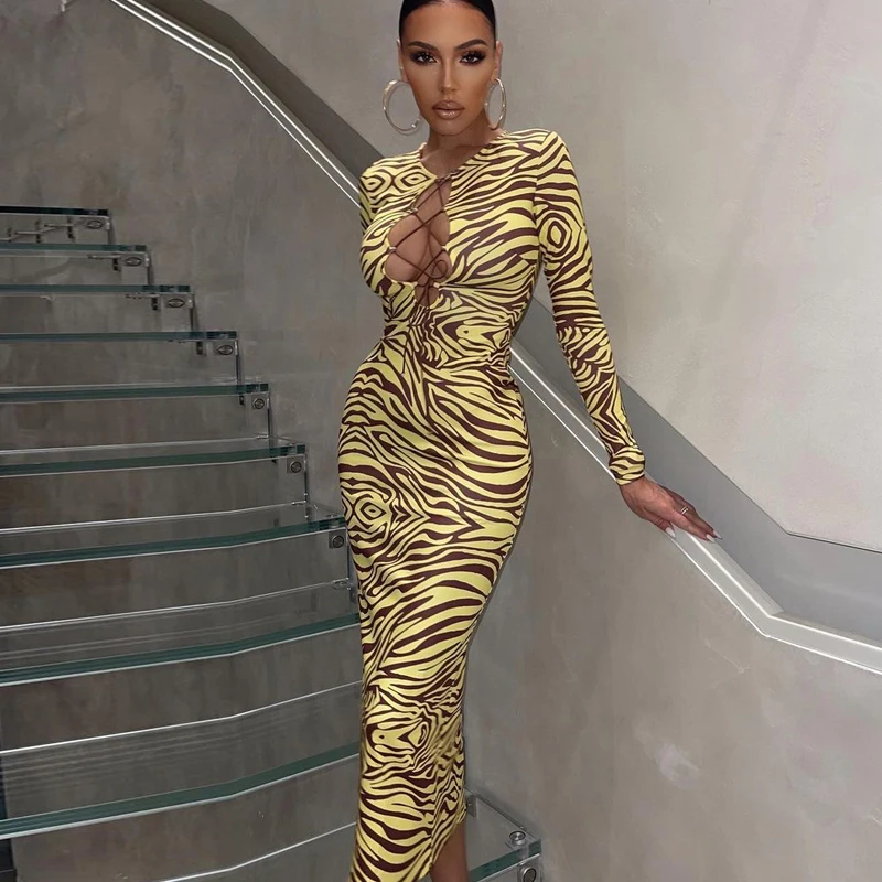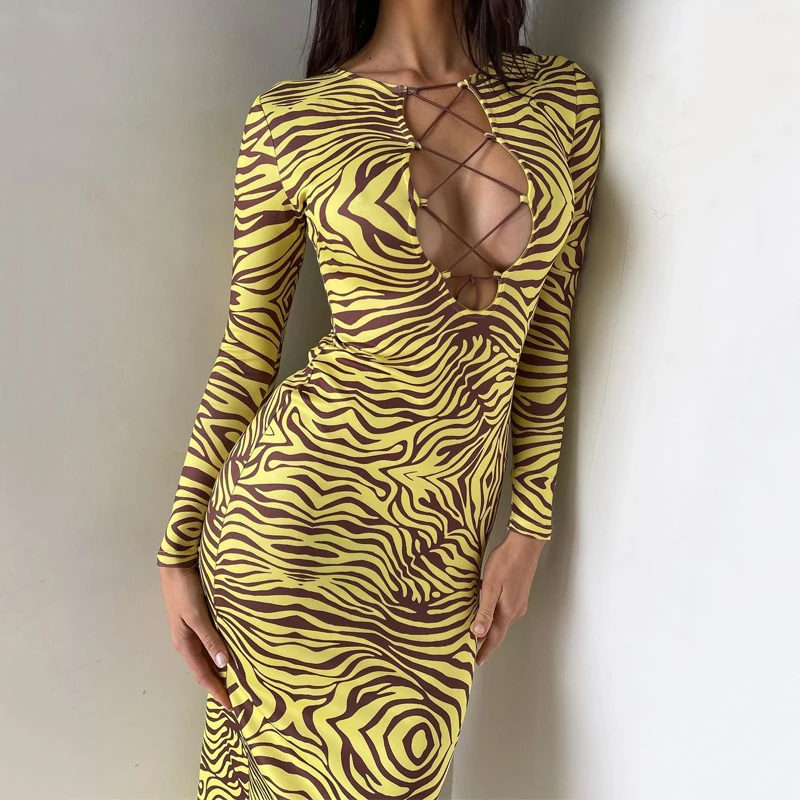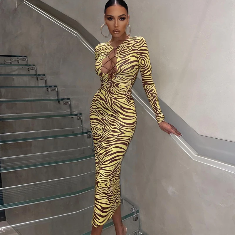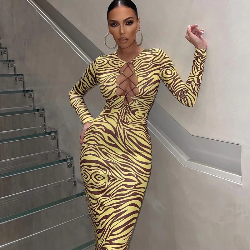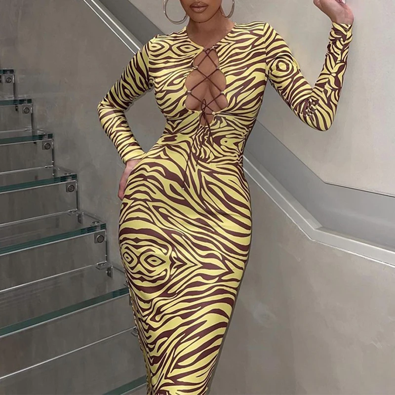 Dulzura Zebra Print Women Long Sleeve Lace Up Hollow Out Midi Dress Bodycon Sexy Streetwear Party Club Festival 2021 Clothes