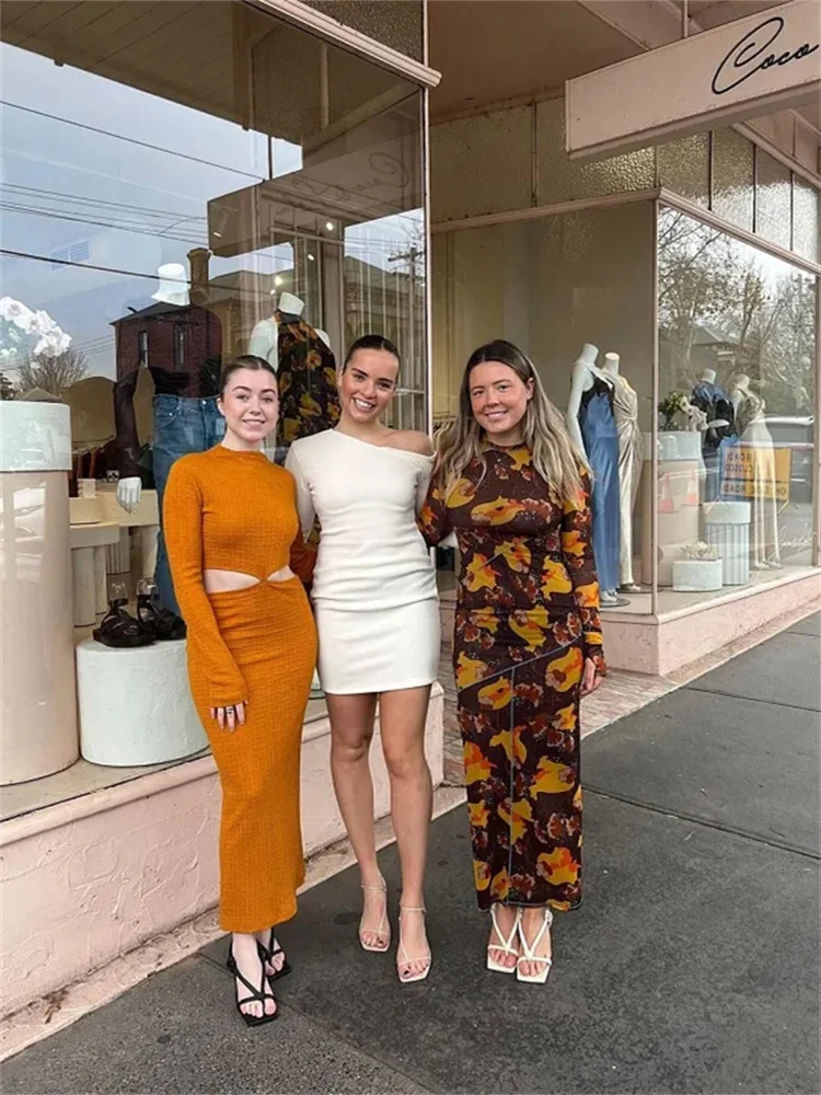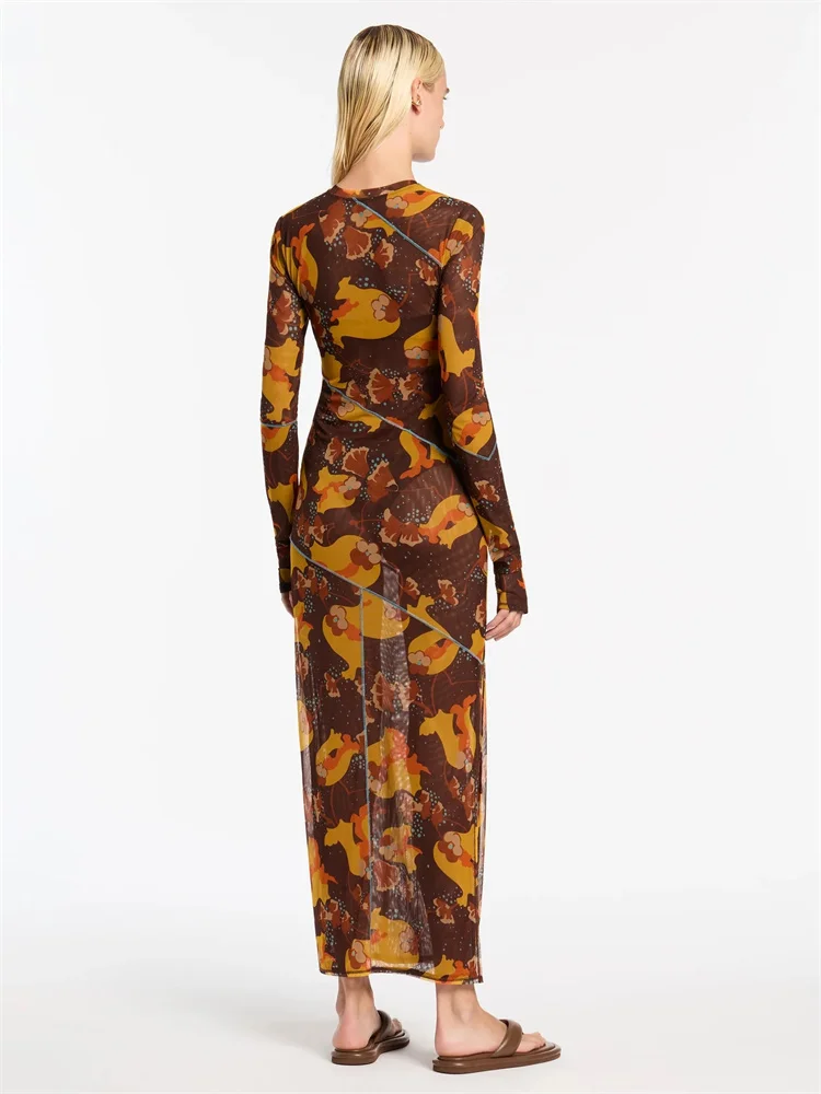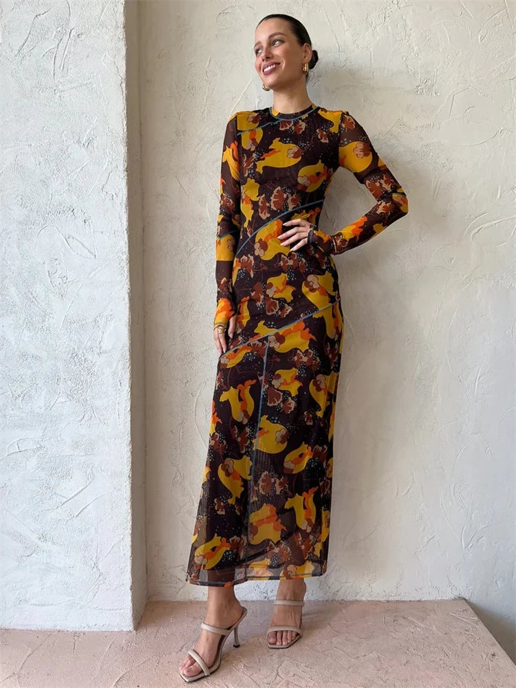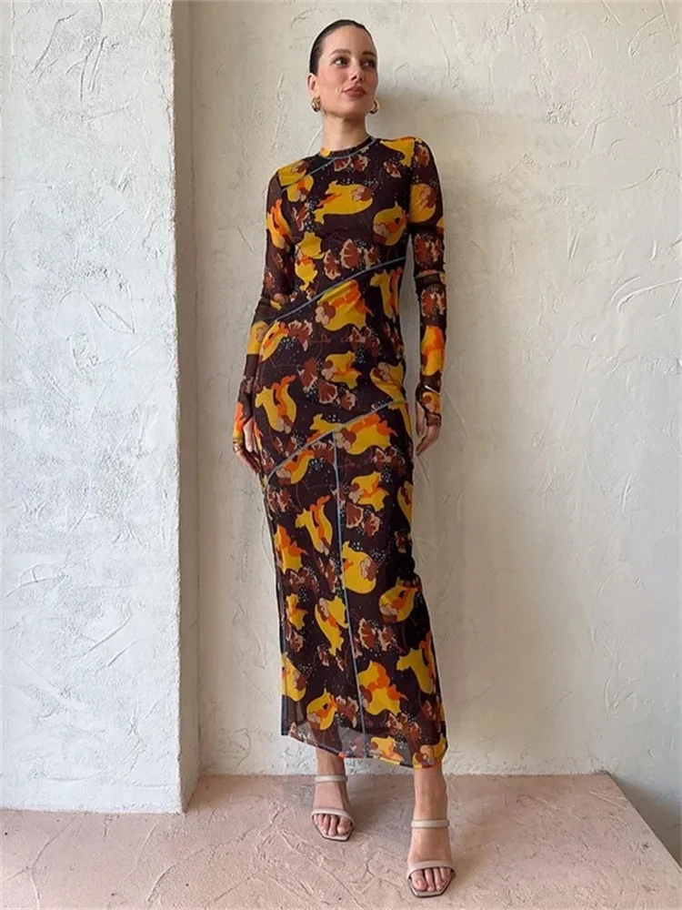 Fantoye Sexy Mesh Printed Transparent Pullover High Waist Women Dress O-Neck Long Sleeve Casual Nightclub Female Dress New 2023