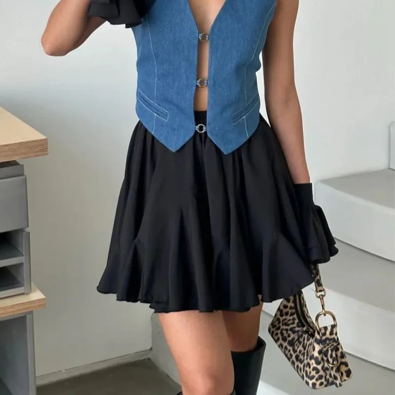 Fashion Mini Skirt A Line High Waist Sexy Cute Ruffle Vintage Tennis Skirt Black Elastic Waist Solid Women Short Skirts For