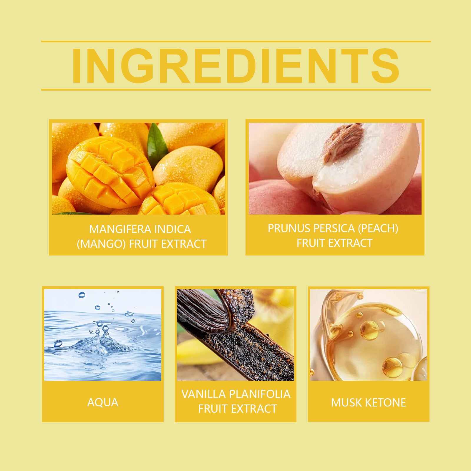 Ingredients: Water, mango extraction, peach cream extract, muscone, vanilla fruit extract