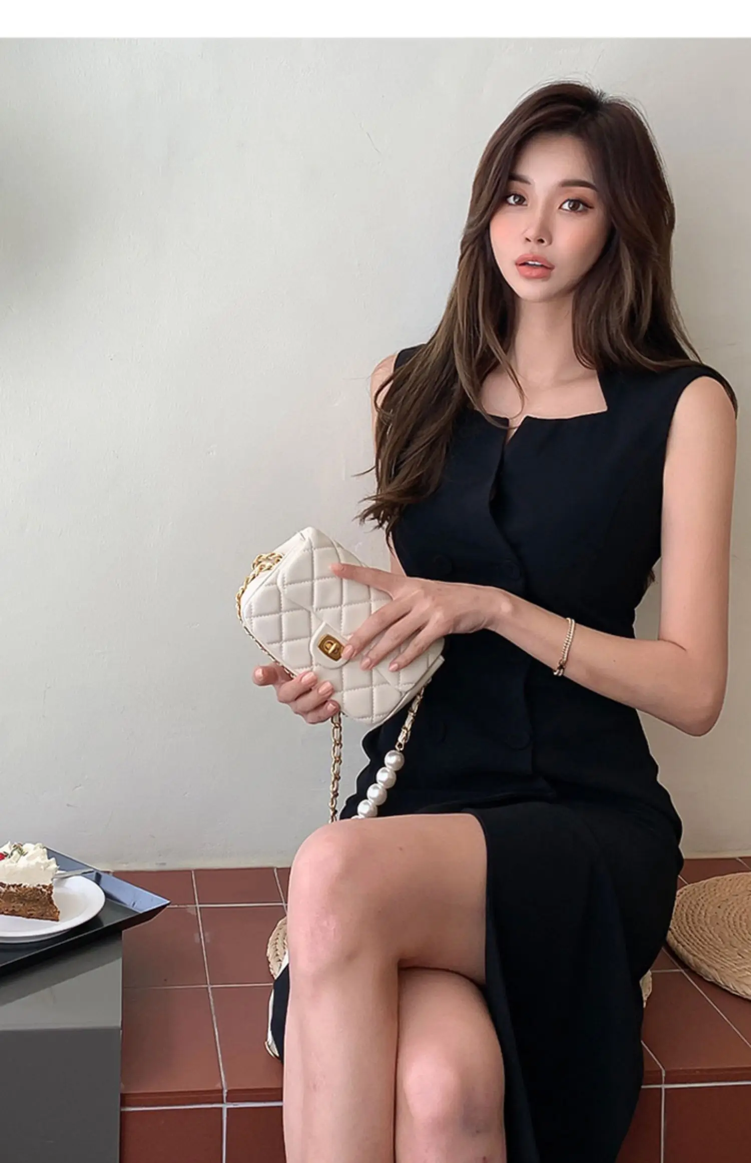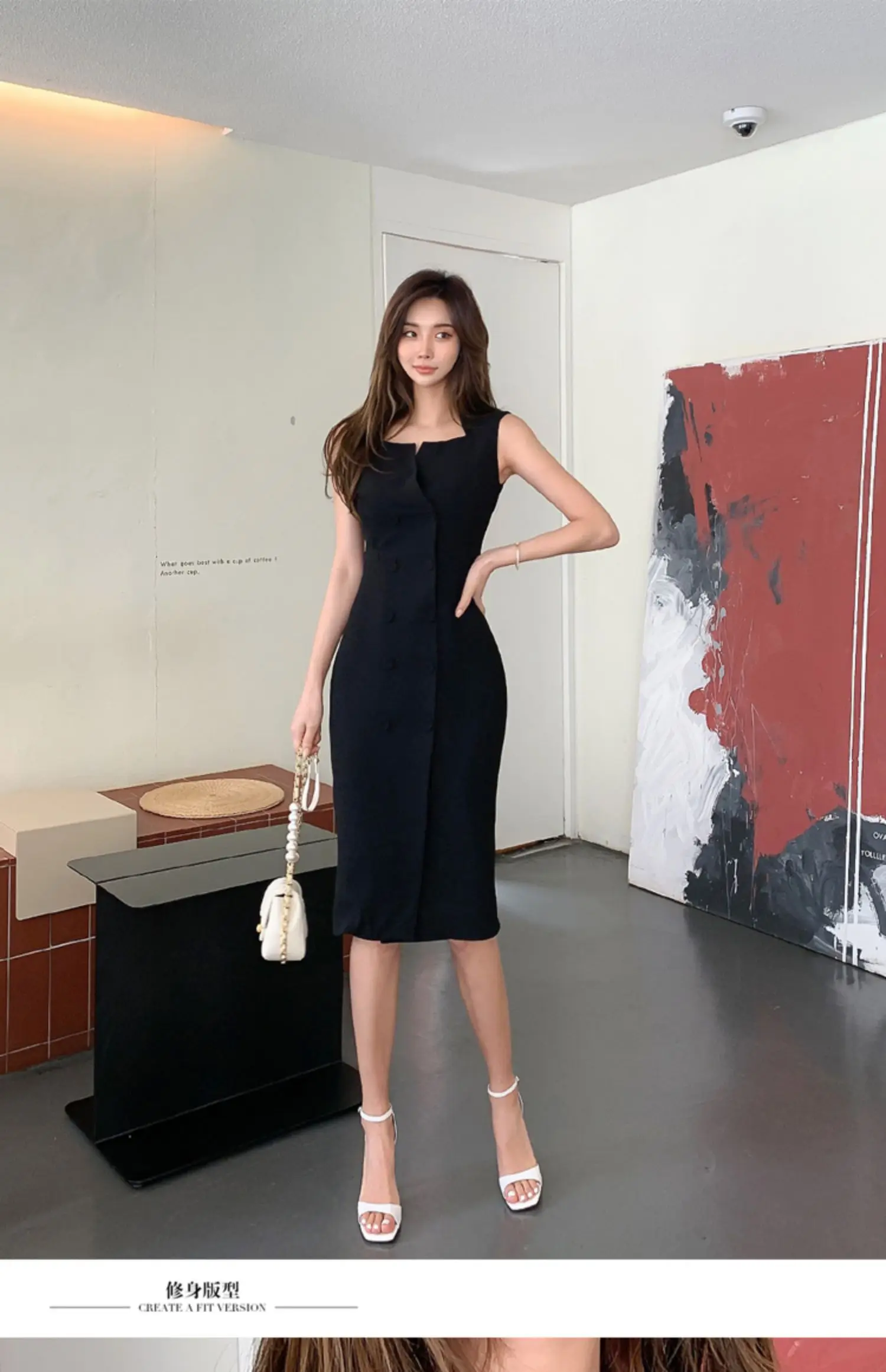 Women's Summer Elegant Bodycon Midi Black Dress Office Ladies Sleeveless Slim Vintage Vestidos Female Fashion Korean Work Cloths