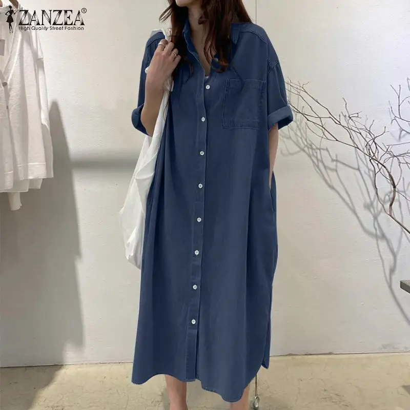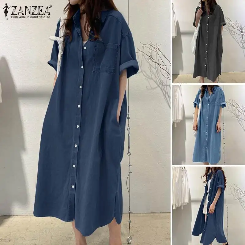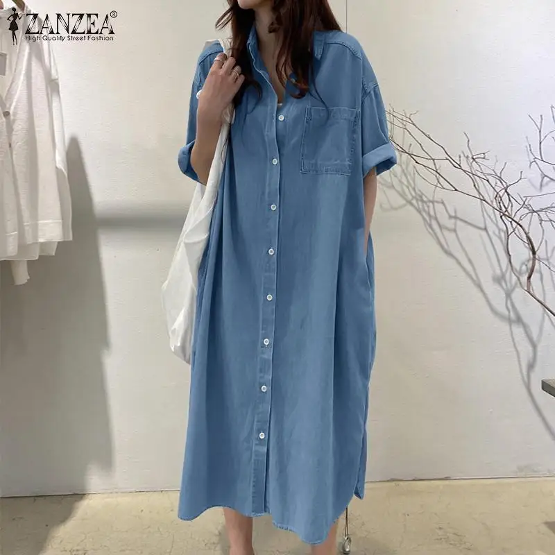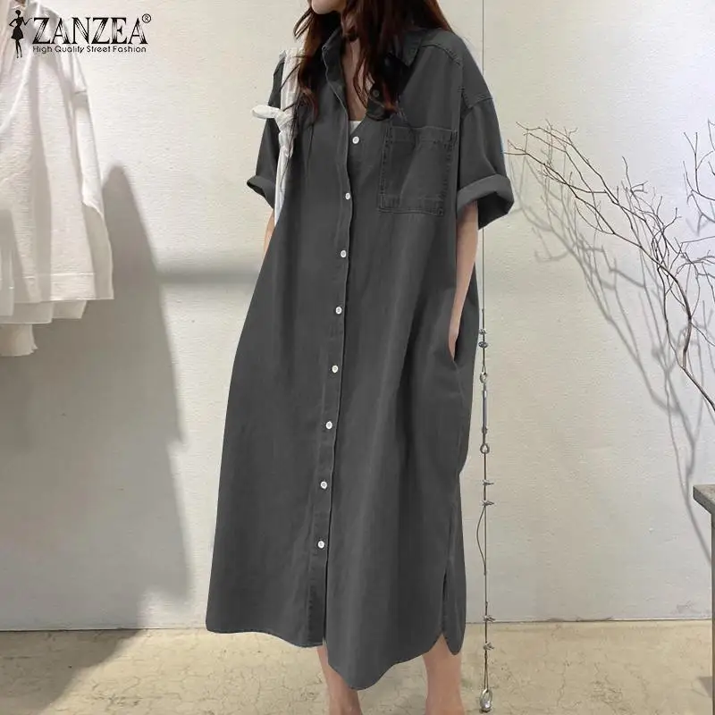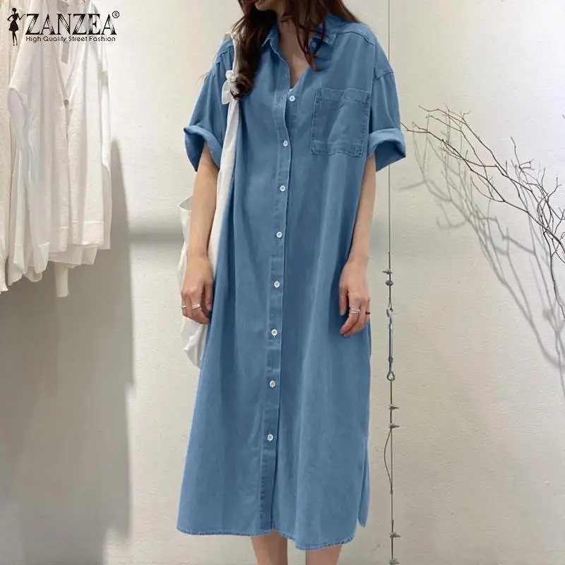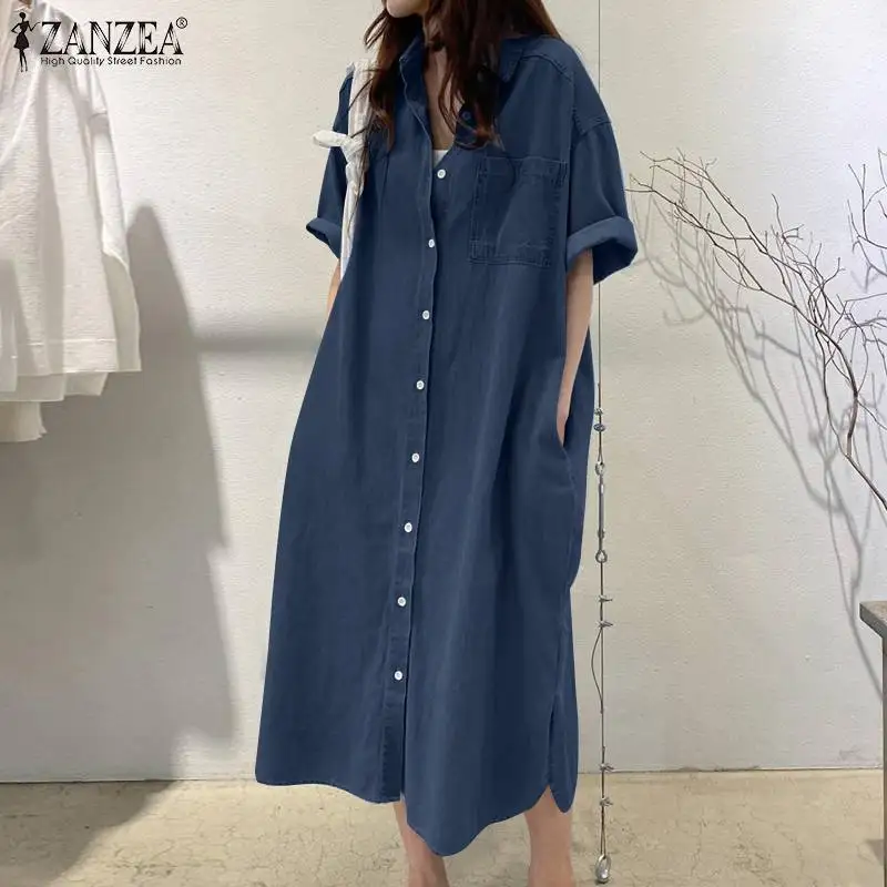 ZANZEA Elegant Solid Sundress Casual Denim Dress Woman Fashion Work OL Vestidos Short Sleeve Lapel Neck Shirtdress Oversized