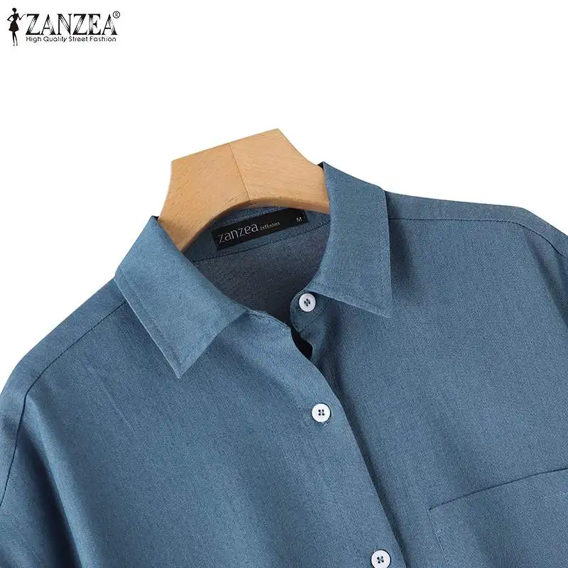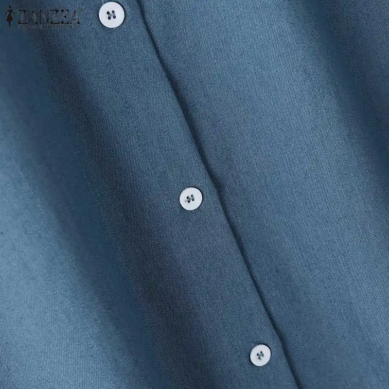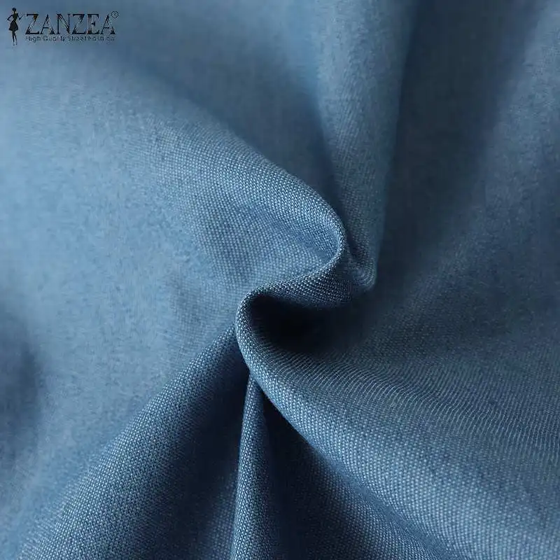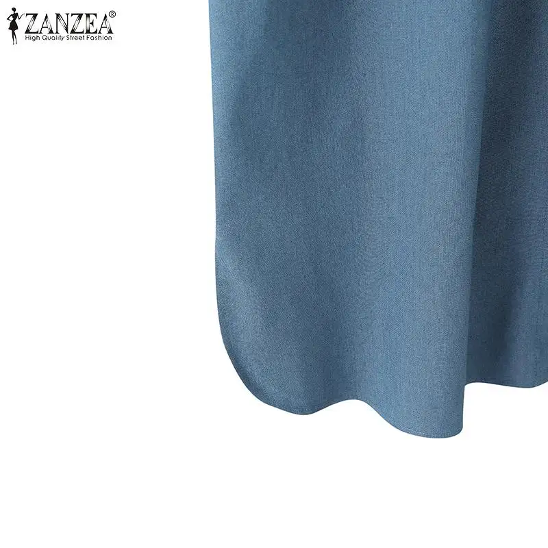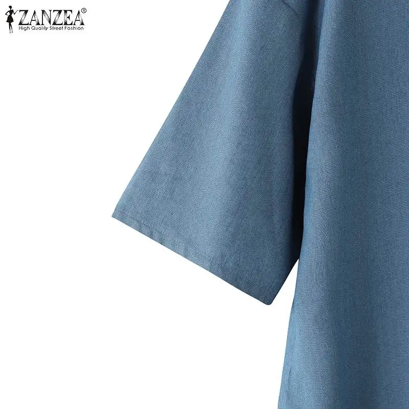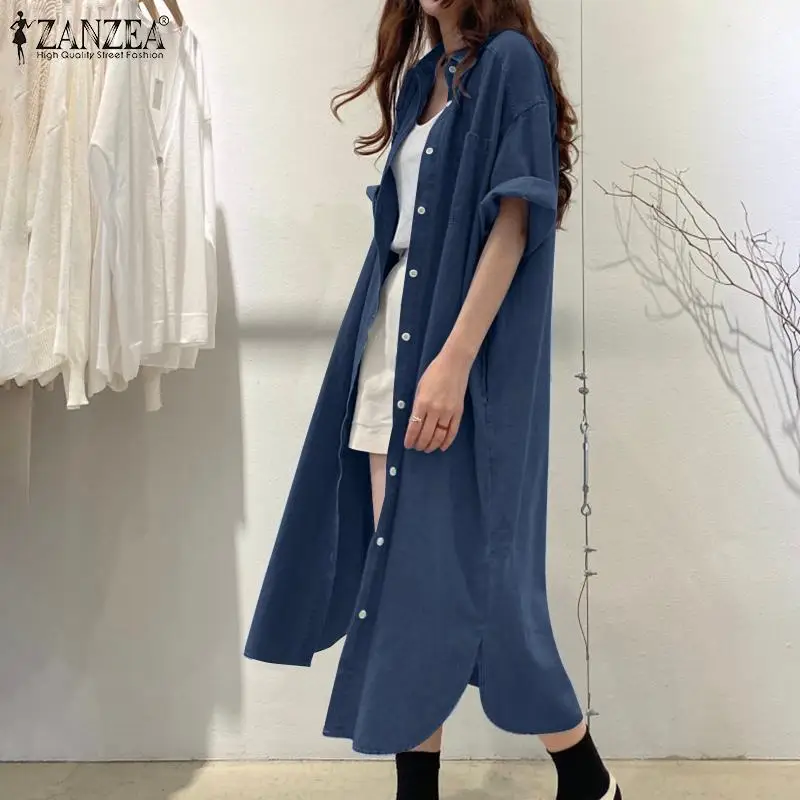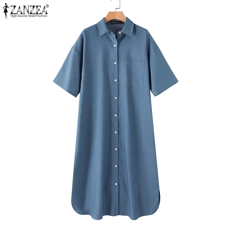 ZANZEA Elegant Solid Sundress Casual Denim Dress Woman Fashion Work OL Vestidos Short Sleeve Lapel Neck Shirtdress Oversized