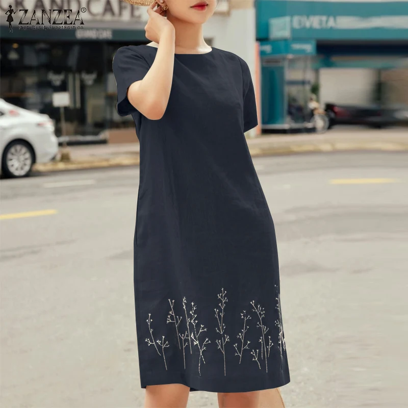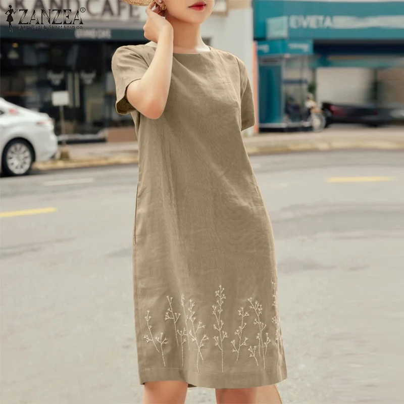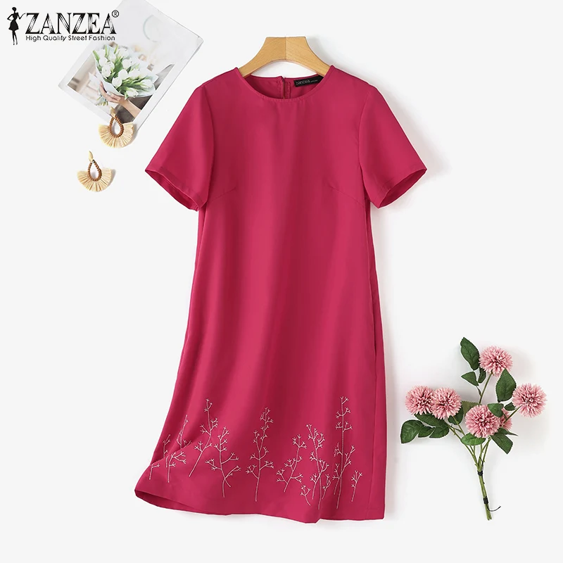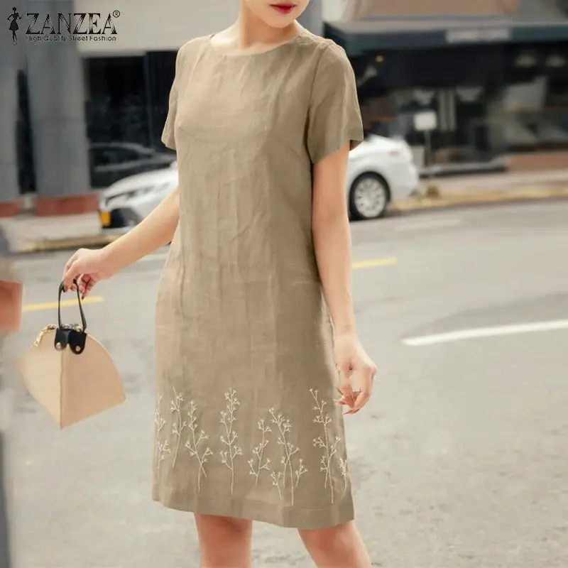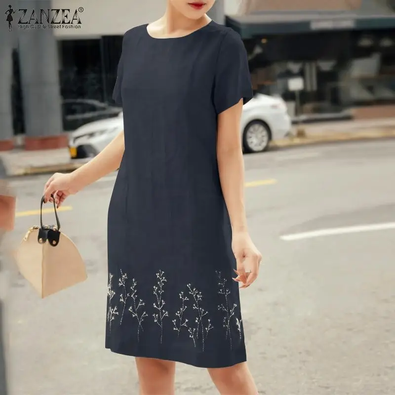 ZANZEA Summer Fashion Floral Embroidery Dress Women O Neck Short Sleeve Sundress Robe Femme Elegant Work Knee Length Vestidos
