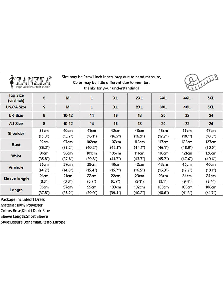 | Package included:1 Dress Material:100% Polyester Colors:Rose,Khaki,Dark Blue Sleeve Length:Short Sleeve Neckline:O-Neck Pattern:Floral embroidery Length:Knee Length Buckle chain:Buttons on the back Thickness:Thin Decoration:Side Pockets Style:Leisure,Bohemian,Retro,Europe Season:Spring,Summer,Autumn,Winter Occasion:Family,Party,Beach,Wedding,Holiday,Employment Label: Yes Attentions: 1.The Real Object May Exist Slightly Colors Differences Compared To Images As Different Computers Display.Caution If Minding,Thanks. 2.There Might Be A Manual Measuring 1-3 cm Error.Sorry For Any Inconvenience. 3.Please Prevail On Real Item, Model Images For Reference Only. 4.Attention!!!Please check the size chart carefully before placing the order.