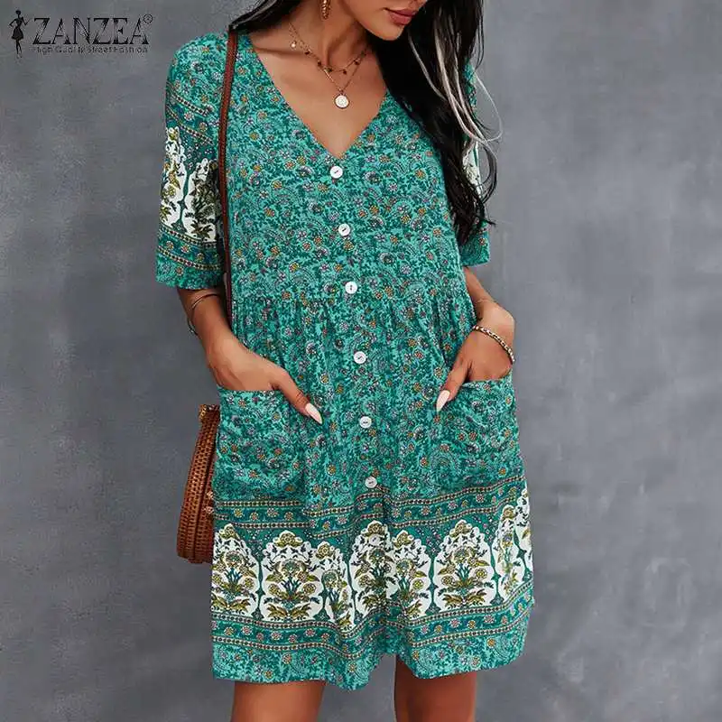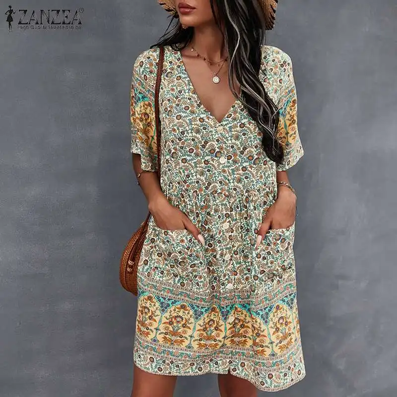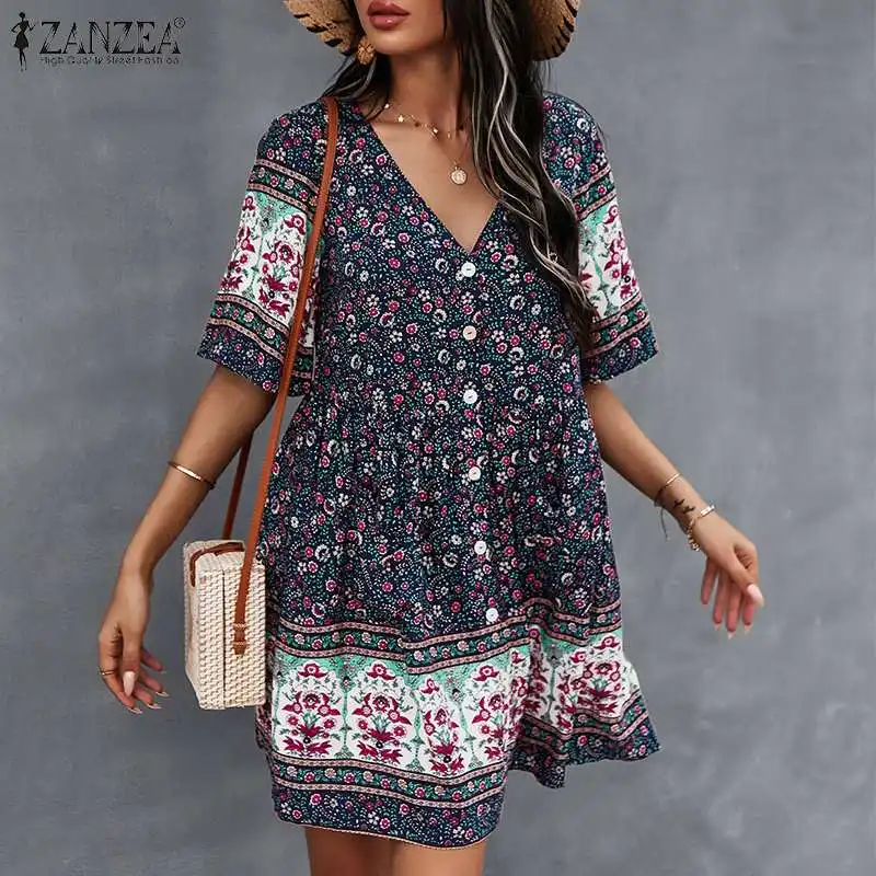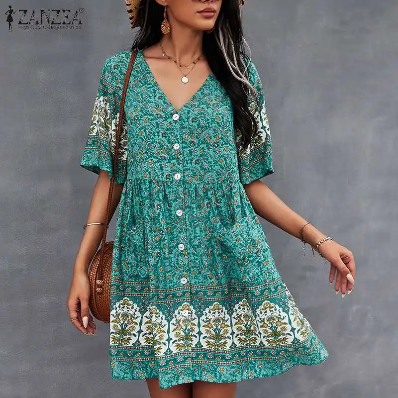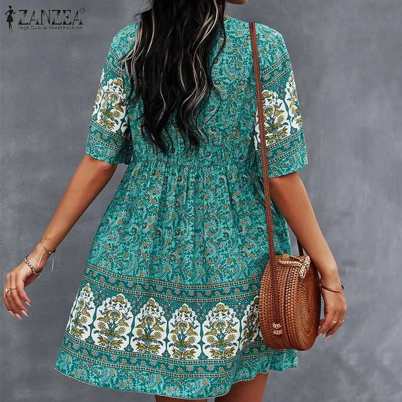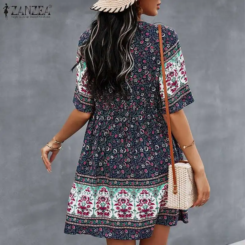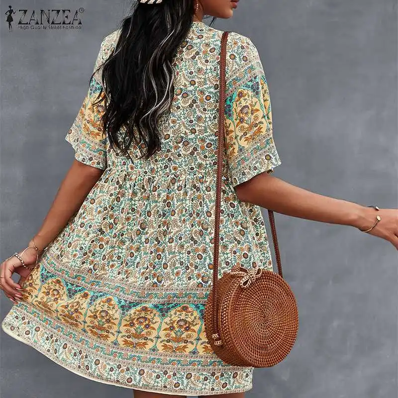 ZANZEA Women V Neck Mini Dress Bohemian Printed Sundress 2023 Summer Short Sleeve Floral Kaftan Ladies Holiday Button Vestidos