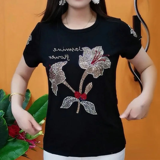 Women's Round Neck Fashion 2024 Summer New Solid Color Printed Letter Diamond Short Sleeve Loose Minimalist Casual T-shirts Tops