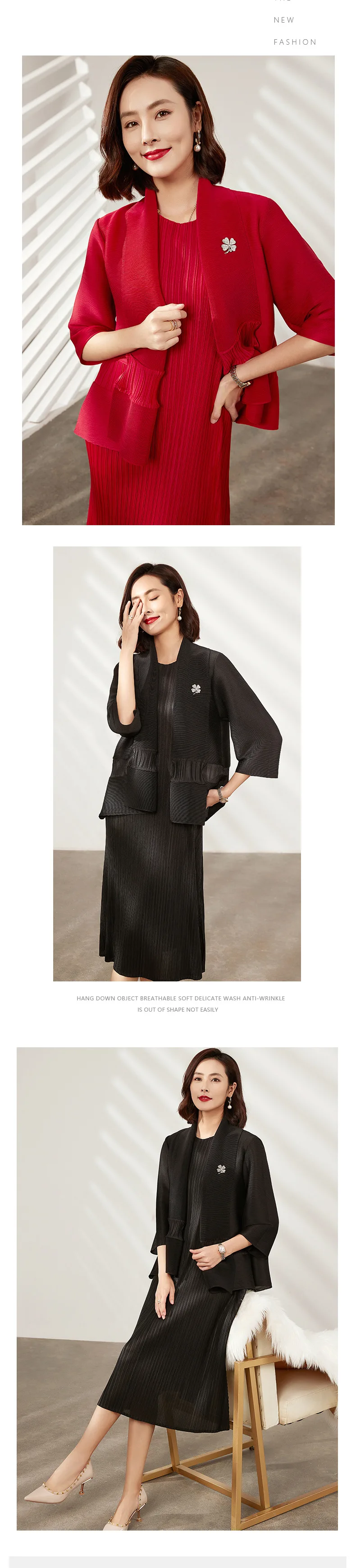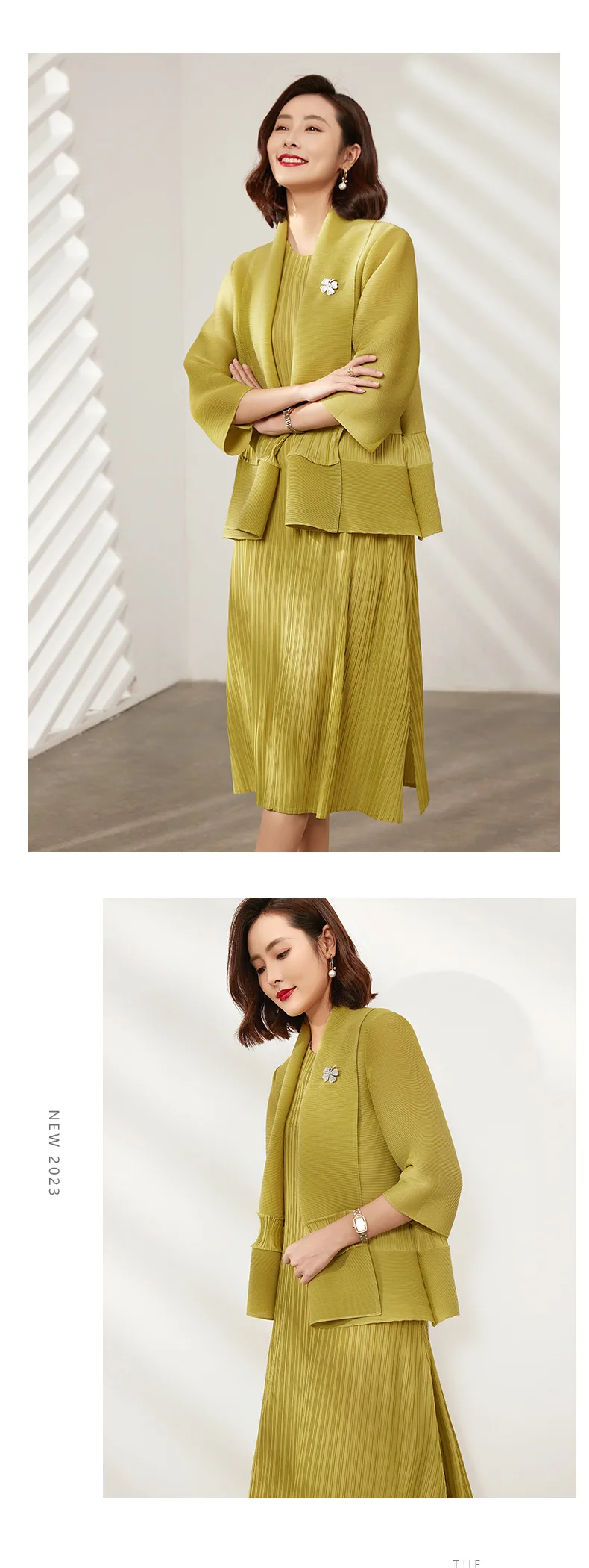 Miyake Pleated Fashion Dress Set, Seven-Point Sleeved Cardigan Top, Slit Midi Dresses, Elegant, 2-Piece