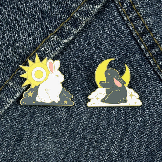 Grey White Couple Rabbit Brooches Cartoon Sun Moon Clouds Bunny Enamel Pin Bag Clothes Badge Animal Jewelry Gift for Best Friend