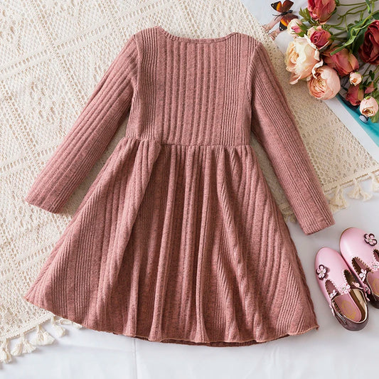 Baby Girl Button Front Solid Rib Knit Long-sleeve Dress Soft and Comfortable Perfect for Outings Daily Casual Wear Kids Clothes